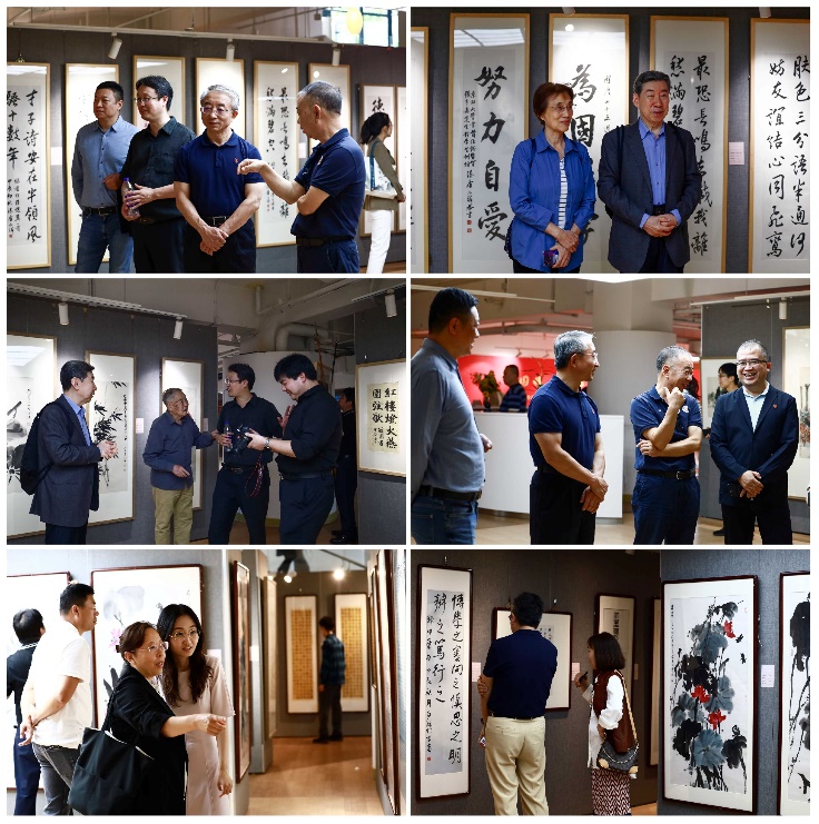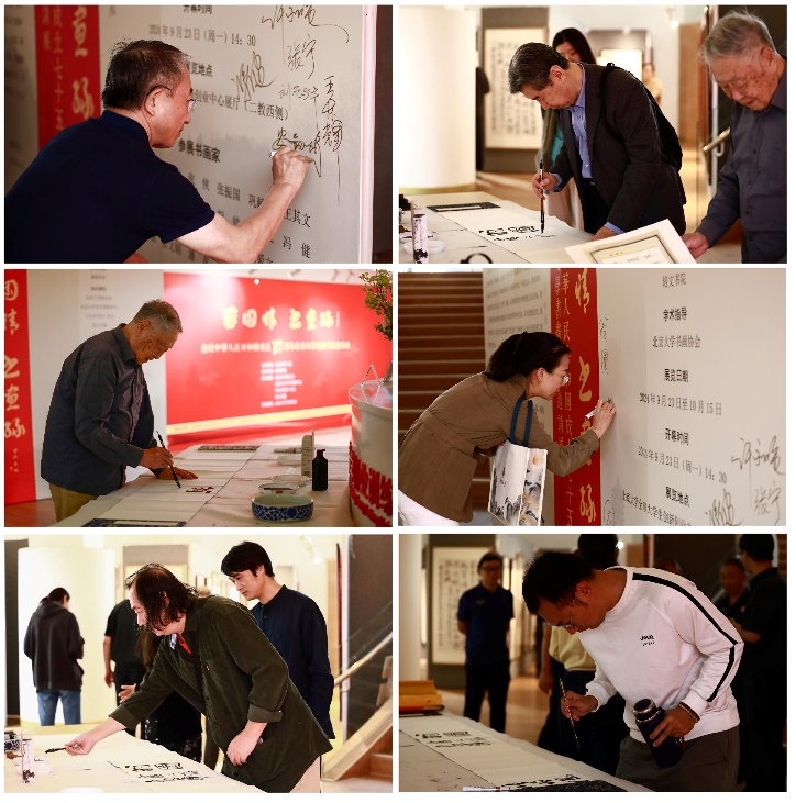 本次展览的主力、参展的北京大学书画家代表也参加了开幕式,包括艺术学院高译;中国语言文学系李宗焜;北京大学书画协会副秘书长刘小刚;艺术学院研究员、中书协理事祝帅;医学人文学院美学与艺术教育中心副主任、中书协理事白锐;哲学系教师、燕园印社秘书长、中央美院书法博士张岩;《大众书法》杂志执行主编、燕园印社副秘书长陈新;李志敏书法艺术研究会副会长郭志全;清华大学科技博物馆教师、燕园印社理事孙德利;生命科学学院教师、燕园印社理事范爱文;燕园印社外联部主任、《大众书法》杂志李敏等。参加开幕式的还有学生书画协会的几任会长:现任会长、艺术学院王建皓,往届会长、中文系博士生杨思思、地球与空间科学学院博士生支啸渤、考古文博学院博士管文韬和外国语学院潘意。还有来自燕园印社、书画协会和书画研究会、学生书画协会的会员们,学生资助中心“中国画”“书法”“篆刻”课程班的学员们以及来自各院系、各部门的书画爱好者等。