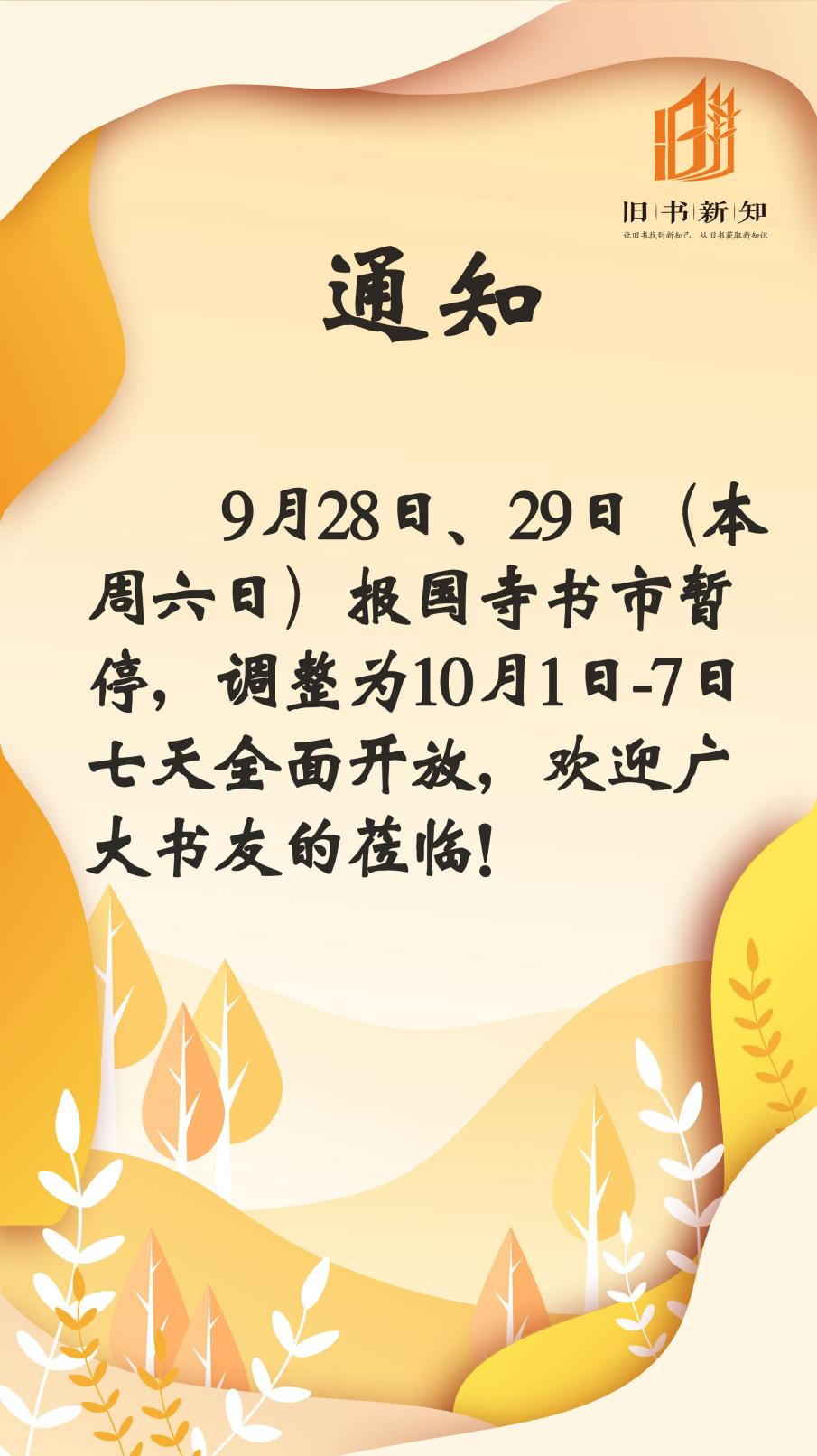 亲爱的读者朋友们,国庆假期,报国寺书市开启国庆七天超长陪伴模式,从10月1日至10月7日,书市全天候开放(因29日为工作日,故28日、29日书市暂停),欢迎爱书的大家前来选购!10月1日当天入园,把自己对祖国母亲真诚的祝福拍照打卡留念,发送到微信朋友圈或小红书,即可领取报国寺呆萌小熊猫玩偶一只!仅此一天限时领取!