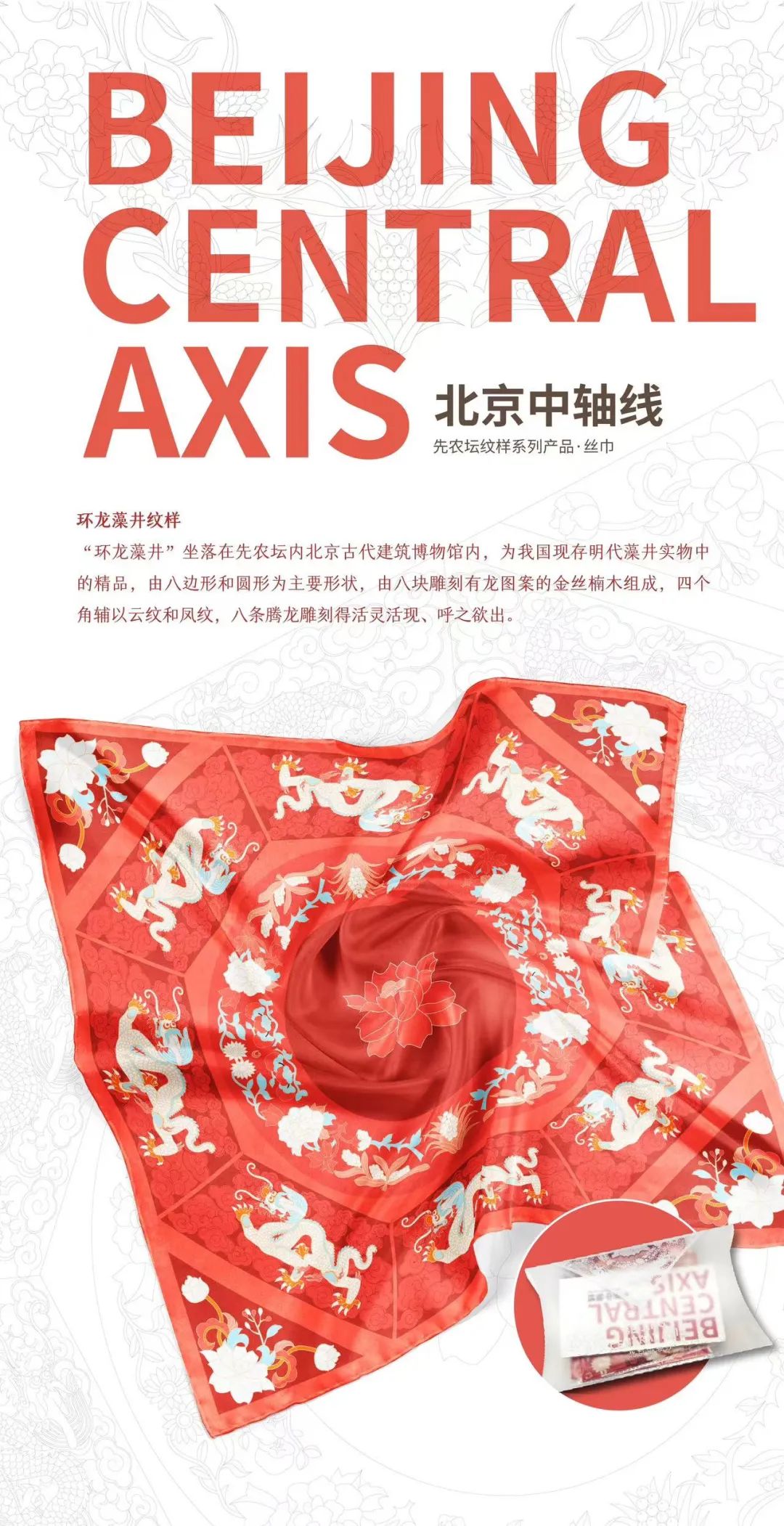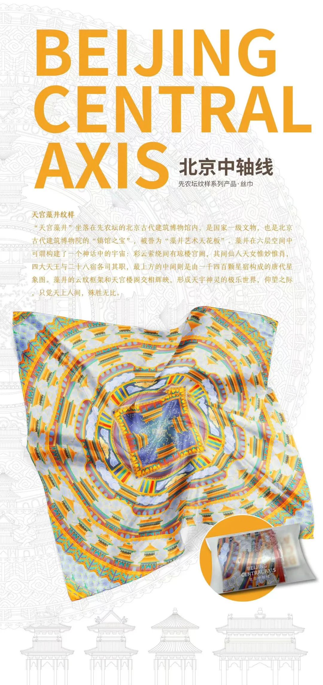 设计之都带来了北京中轴线纹样桑蚕丝丝巾,图案涵盖了先农坛、景山等中轴线地标,将文化穿在身上,感受传统与时尚碰撞带来的魅力。