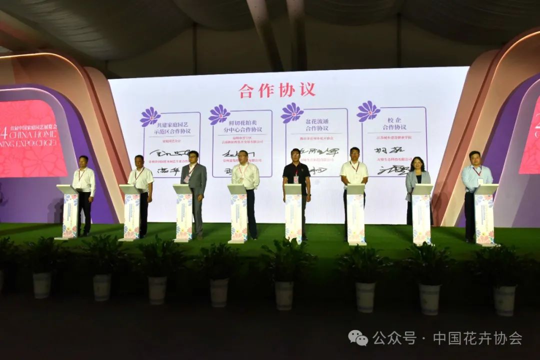 在开幕式上还进行了4项合作签约仪式和授牌仪式。家庭园艺分会与常州市田园花木园艺专业合作联社签订共建家庭园艺示范区合作协议,昆明市晋宁区云南新征程花卉交易有限公司与常州嘉发控股集团有限公司签订鲜切花拍卖分中心合作协议,潍坊市青州市花卉协会与万臻生态科技有限公司签订盆花流通合作协议,江苏城乡建设职业学院与江苏夏溪花木市场管理有限公司签订校企合作协议。江苏省广播电视总台江苏城市频道向万臻生态科技有限公司授予了江苏城市频道《完美花园》栏目摄制基地的牌匾。