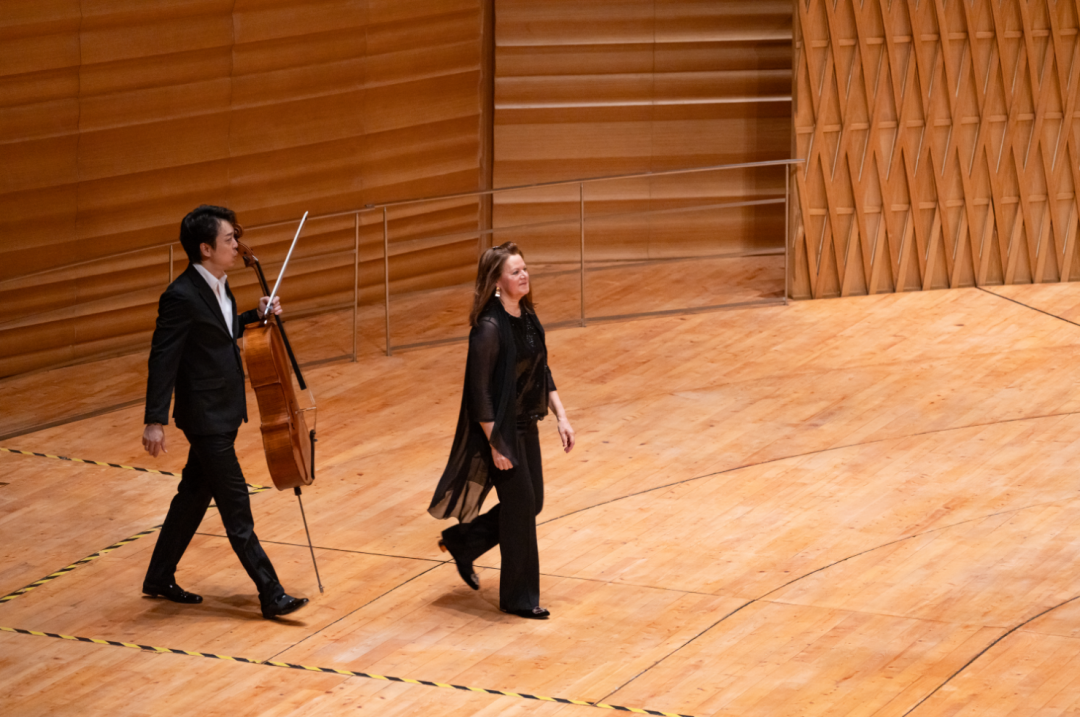 音乐会渐入佳境,勃拉姆斯的《e小调大提琴与钢琴奏鸣曲》与拉赫玛尼诺夫的《g小调大提琴与钢琴奏鸣曲》的演绎尤为引人注目,斯托特在作品中展现了她那跳跃而精准的弹奏,自如而充满力量,游刃有余。在钢琴与大提琴的配合中,对话感十足。尤其在勃拉姆斯的作品中,钢琴有效地填补了大提琴的每个气口,但又使得整个演奏充满了呼吸感。在拉赫玛尼诺夫的《g小调大提琴与钢琴奏鸣曲》中,两人在演奏中的力度控制极为精准,对音乐的平衡性把握得恰到好处,整体上流动自然、富有层次。秦立巍的大提琴与斯托特的钢琴相互呼应,共同构建了一个充满张力和动态的音乐世界。当晚演奏的音乐厅以其音效备受称赞,似乎当日的空气湿度也达到了一个完美的平衡点,让人不仅感叹一切都那么完美,造就了这温润、饱满的音色。