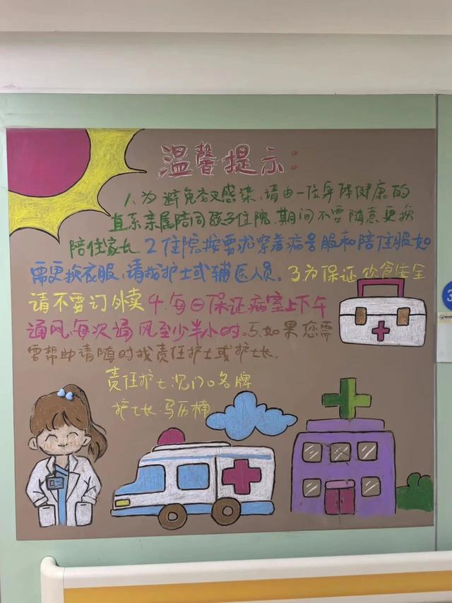 走进病房,首先映入眼帘的是墙上一幅幅色彩斑斓、内容丰富的手绘板报。这些板报由护士小姐姐们精心绘制,每一笔都蕴含着她们对工作的热爱与对患者的关怀。从基础的疾病知识介绍,到实用的护理小贴士,再到温馨的生活提示,板报上的内容既满足了患者的信息需求,又增添了病房的温馨氛围。