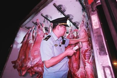 “这些肉的含水量都符合不高于77%的国家标准。”在检查完猪肉含水量符合标准后,佟叔明和其他执法人员,随机抽取其他牛羊肉等肉类进行含水量快速检测。