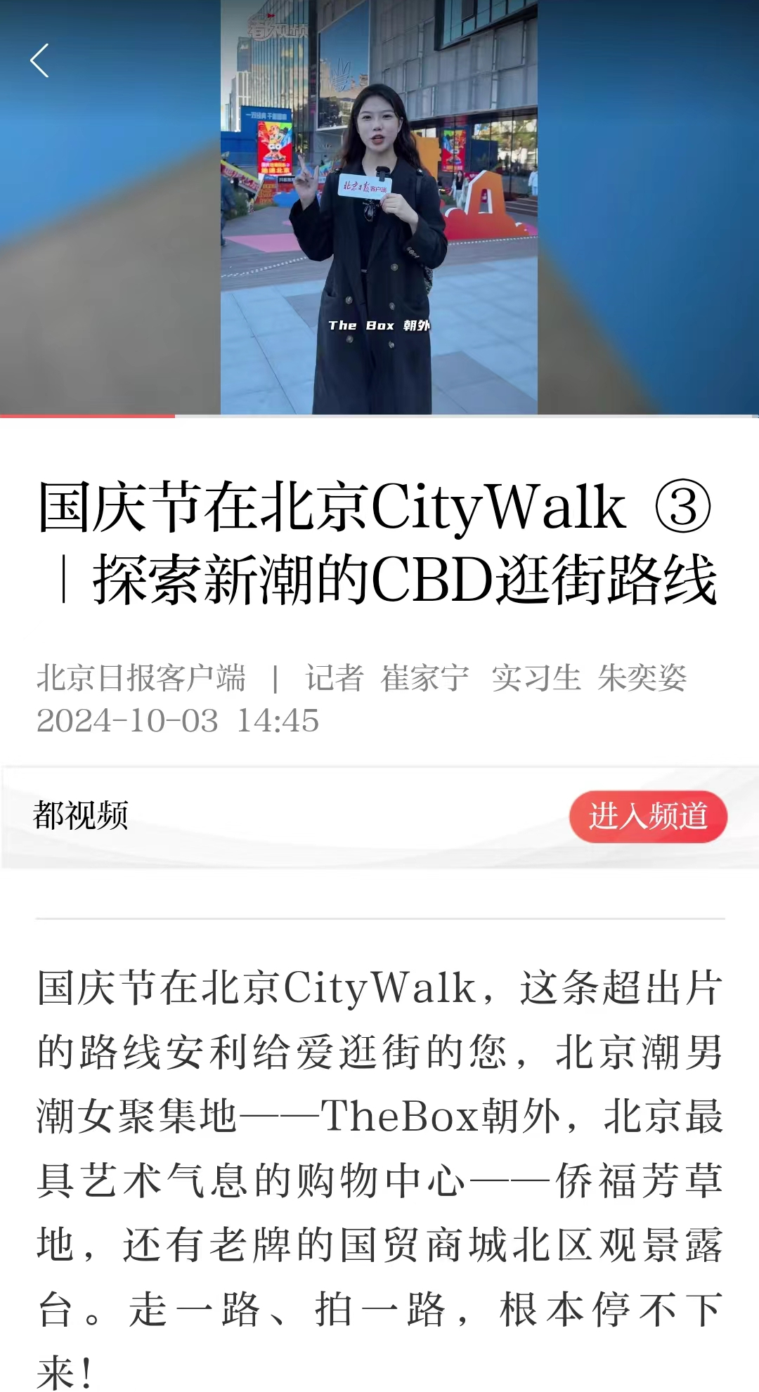 北京日报推出《国庆在北京CBD City Walk|探索新潮的CBD逛街路线》视频,介绍北京CBD打卡线路,让游客感受都市魅力。