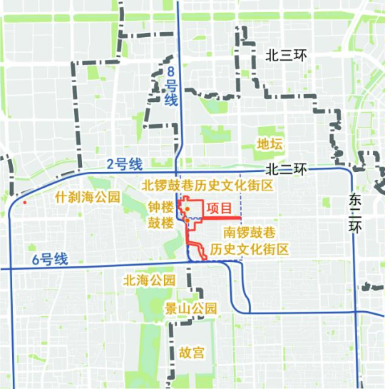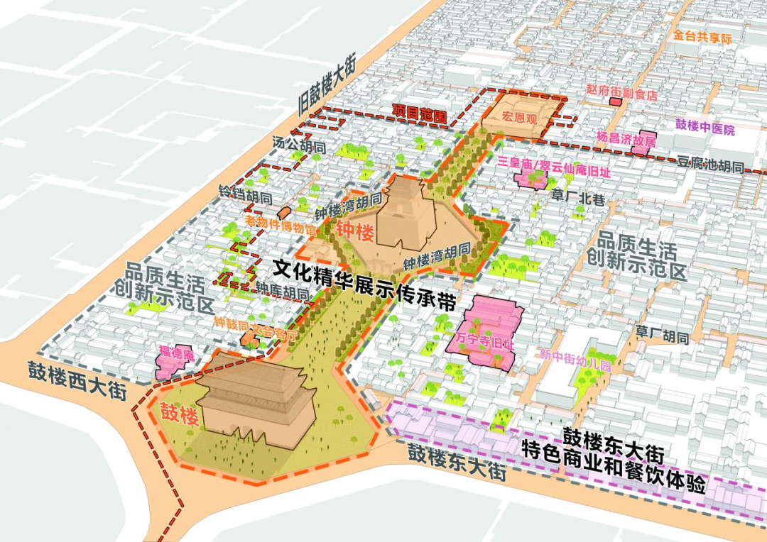 东城区钟鼓楼片区位于中轴线最北端,总面积约25.7公顷,涉及630余座平房院落,建筑规模达10.6万平方米。为助力中轴线申遗,自2020年起实施片区保护更新,主要任务有文物保护修缮和活化利用、平房院落第五立面整治提升、街巷和公共空间环境整治提升、玉河环境提升与水体治理等。一系列的实践聚焦中轴文脉的保护与传承,促进了北京老城整体保护与更新,充分展现了钟鼓楼片区高度融合国家礼仪秩序与市井百姓生活的风貌特色。