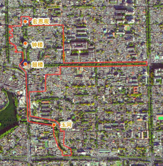 钟鼓楼建筑本体、室内外空间环境、周边围墙得到保护与修缮,钟鼓楼广场铺装、绿化、照明等设施完成整治与提升,中轴线上再现钟鼓楼崭新风貌。宏恩观通过文物腾退和修缮,重新亮出庄严宏伟的三大殿,得以恢复的历史院落格局与宽大的歇山顶、古朴精美的券窗等,重塑出中轴线上的“龙尾之要”。