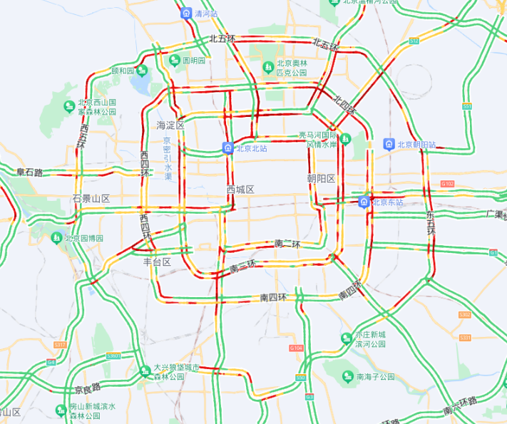 城区东部、北部、西部主要环路,万泉河路、阜石路、莲石路、菜户营南路、广渠路等主要联络线,京藏、京承、京港澳、京开、首都机场、京通快速等高速公路早晚高峰进出城潮汐特征显著,月坛、西便门、朝阳门、CBD、航天桥、五棵松等重点区域压力集中。