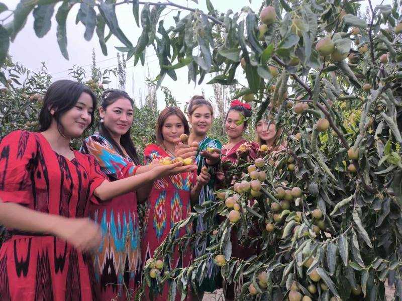 游客在枣园体验采摘乐趣。古丽阿亚提 摄
