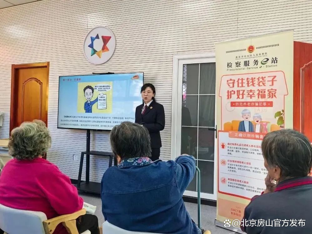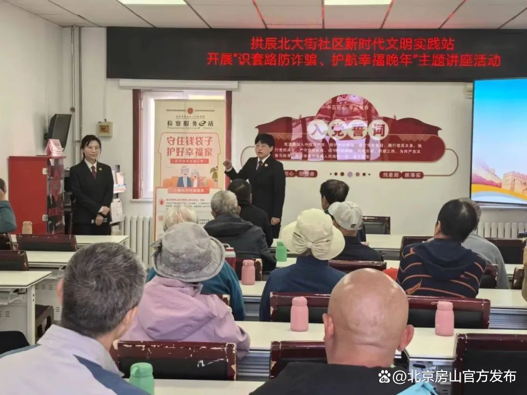 房山区检察院以法治力量积极护航“夕阳红”,通过开展系列社区普法宣传活动,引导老年人增强法律意识和自我保护能力。检察院干警走进燕化星城社区以“识套路防诈骗,护航幸福晚年”为主题,进行防诈反诈宣传,以案释法,普及养老诈骗常见手段和防范方法。联合北京基金小镇投教基地,赴拱辰北大街社区开展宣传活动,引导老年群体理性投资,正确运用法律手段维护自身合法权益。