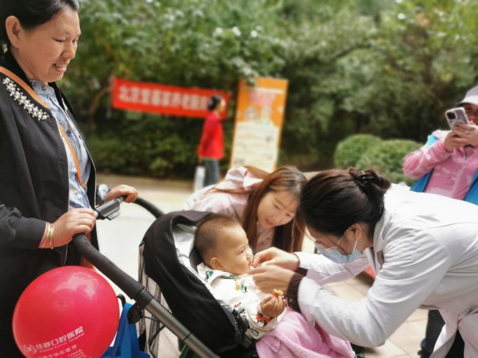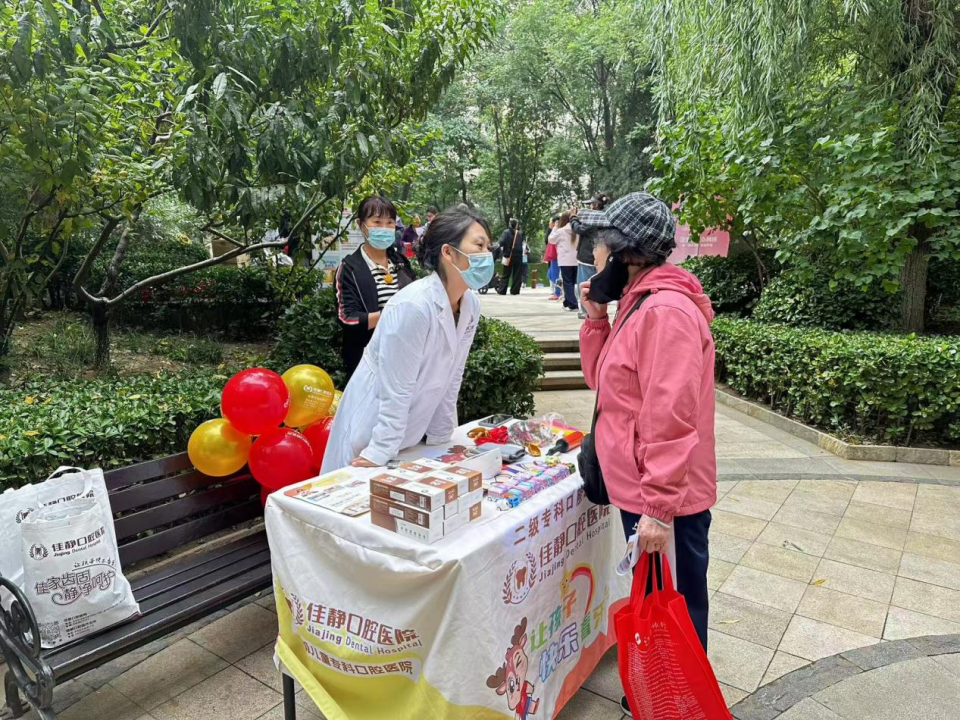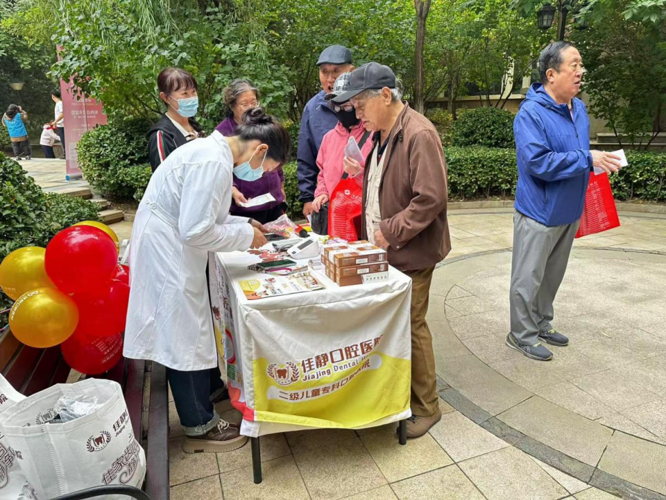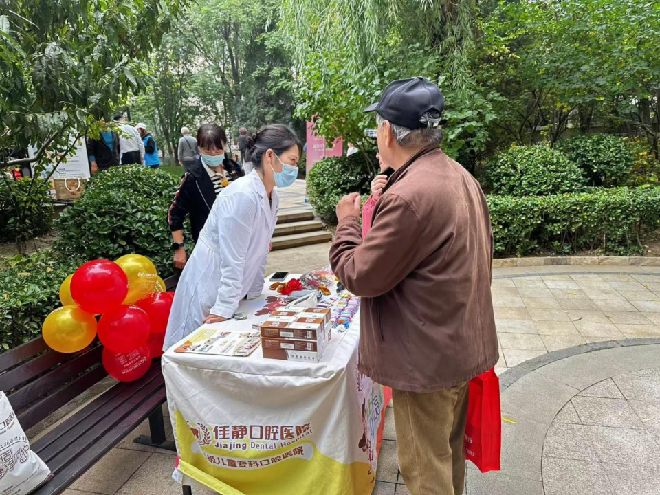 “健康义诊打卡区”由佳静口腔和中海九浩苑养老驿站联合提供服务,专业医护人员在这里免费提供口腔健康检查和咨询,通过发放宣传册普及保健知识,旨在提升大家的口腔健康意识和自我保健能力。中海九浩苑养老驿站为老年居民提供血压、血糖等基础检测,并针对常见慢性病给出保健建议。