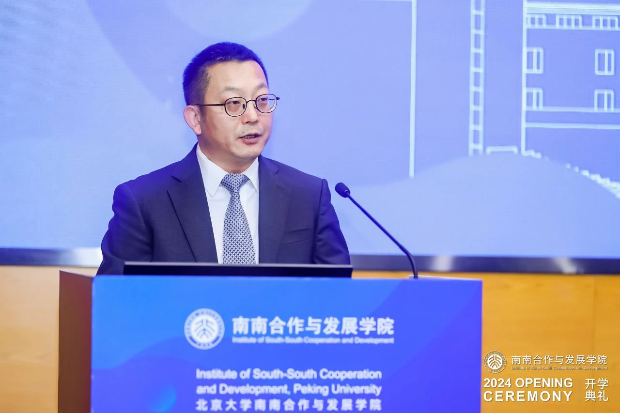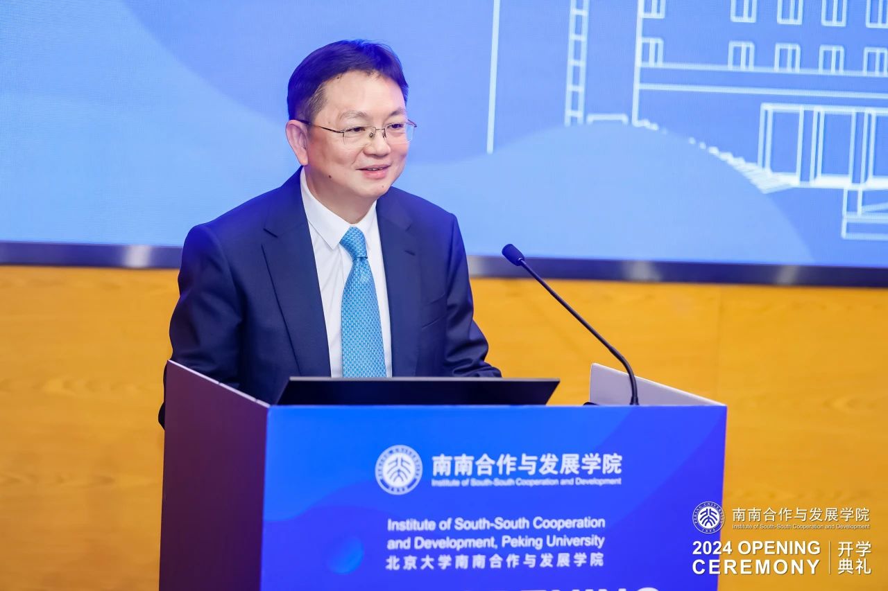 凌激在致辞中向南南学院2024级硕博班新学员表示祝贺和欢迎。他表示,“一带一路”倡议为全球经济增长不断作出中国贡献,中国式现代化创造了人类文明新形态,开辟了发展中国家走向现代化的新途径。当前百年变局加速演进,全球南方国家群体性崛起,这已经成为影响国际政治经济格局的重要力量。南南学院是在习近平主席亲自关心、亲自推动下建设和发展起来的。中国商务部会同北京大学对南南学院的师资配备、课程设计、学员管理等工作进行了指导,推动学院打造更多的精品课程。不少学员毕业回国后成为了本国改革发展和经济发展的领导者。他希望同学们在学习的过程中,既要学习北京大学爱国进步、民主科学的理念,又要将中国式现代化作为最大的社会课堂,走进中国的城市、乡村、工厂、学校和企业,广交朋友,既领略中华悠久历史文明,又感受中国迈向现代化的活力。