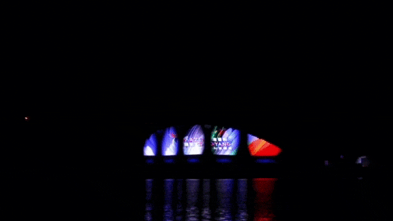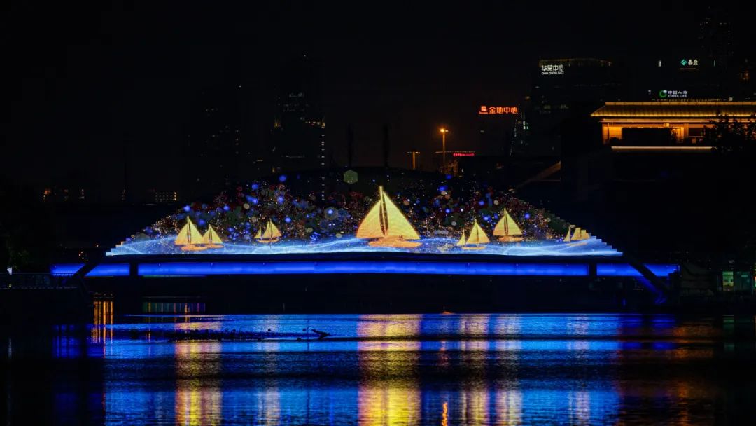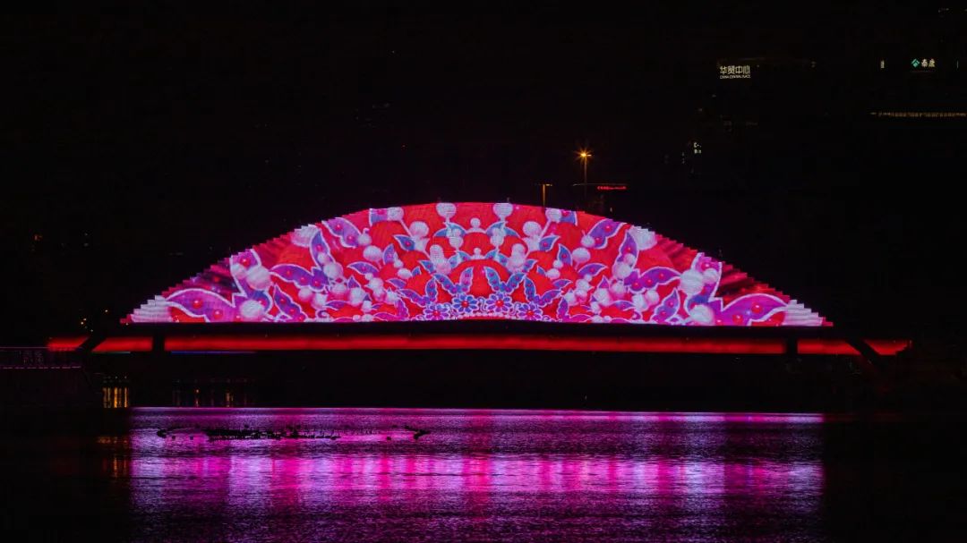 高碑店地区同心桥以“山月入梦·古韵京华”为主题,光影扇面上,千里江山图、牡丹、华冠、流水、翠峦以及高碑店地区特色“小金鱼”等元素倒映在水面上,一时间水光潋滟、古色古香。