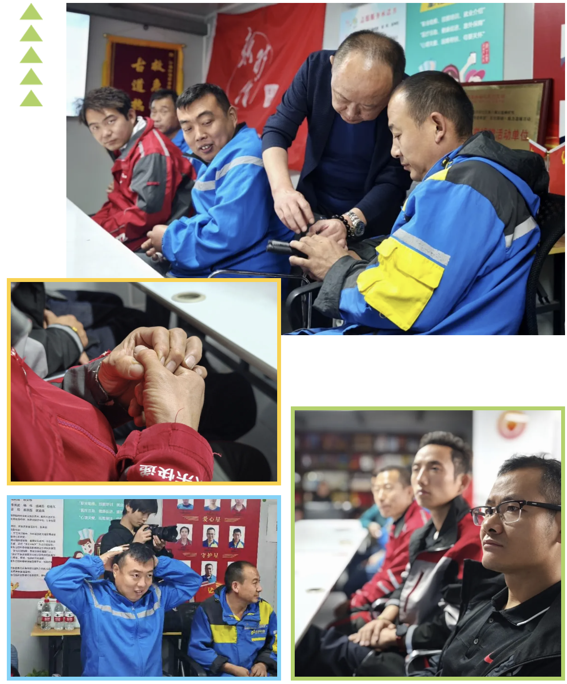 在互动环节中,刘昕老师还向“快递小哥”们传授了一系列既具实用性又简单易操作的缓解情绪小妙招,如积极自我暗示、按摩穴位减压等,并细心示范、手把手指导,“快递小哥”们饶有兴致地体验、感受,逐渐缓解了自己的紧张情绪。