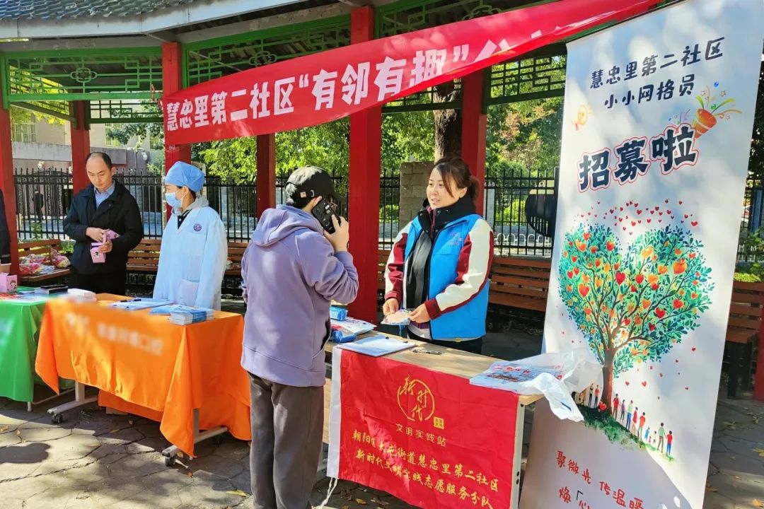 慧忠里第二社区邻里互助公益市集现场,健康义诊、义务理发、政策宣传、法律咨询……各摊位前都排着长队,多种多样的便民服务吸引着周边居民前来体验。