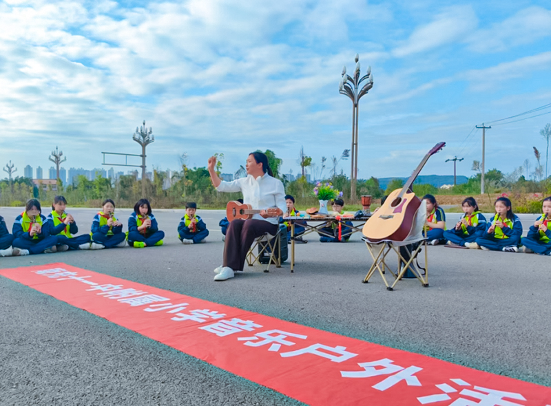 到达学校附近的一条暂未开放的宽广的公路上,学生们按班围坐成一圈,开展了一场别开生面的户外唱歌活动。音乐杨文丽老师首先带领大家唱起了《让我们荡起双桨》这首经典儿歌,优美的旋律和孩子们稚嫩的歌声交织在一起,将大家带去了无忧无虑的快乐时光。