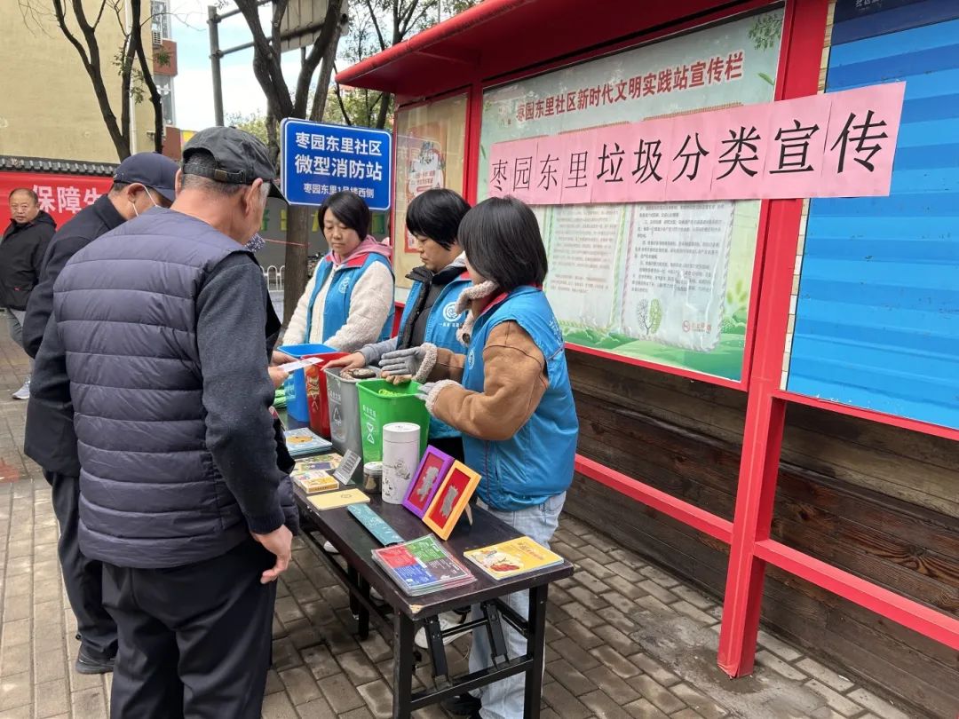 枣园东里社区盛芳茗苑小区作为垃圾分类试点社区,积极调动社区多方力量参与垃圾分类工作。社区居民每天在投放时段内(早上7:00-9:00,晚上18:00-21:00),完成一次生活垃圾分类投放以及积极参与“户户轮值”桶前值守,均可获得积分,用来兑换卫生纸、洗洁精等生活用品,并且社区对每月表现积极的家庭进行表彰。