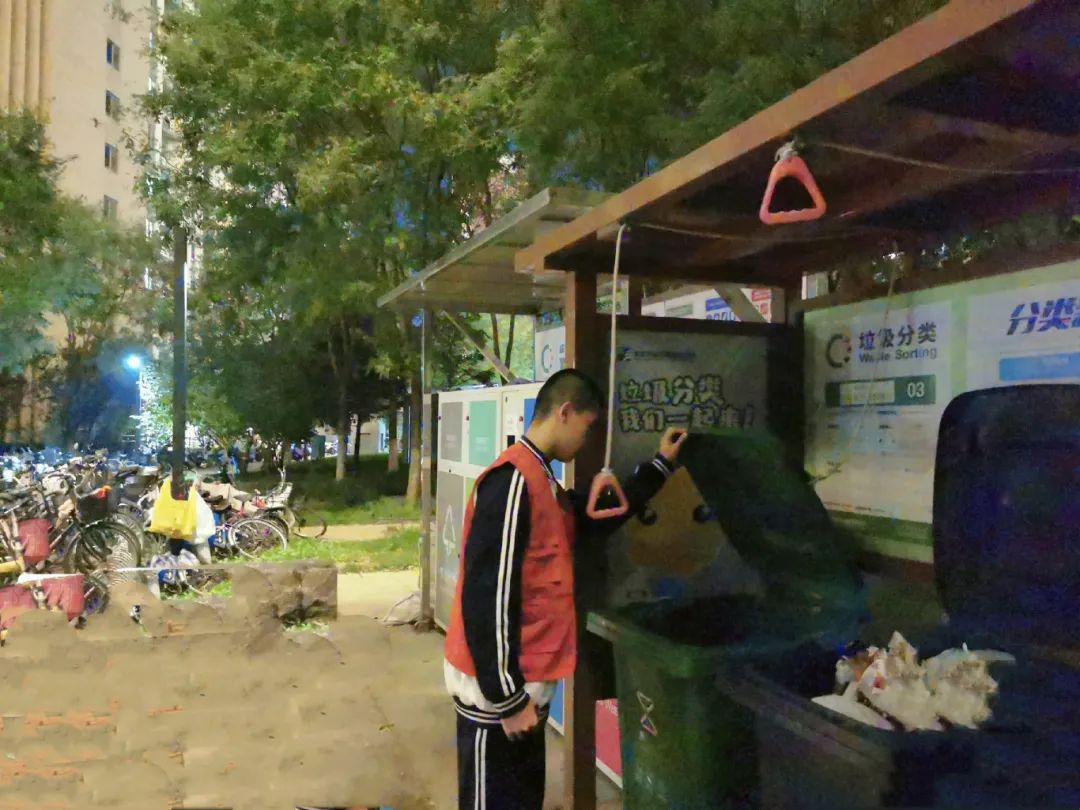 “您好,这些水瓶应该放到蓝色的可回收物桶中。”晚上7点,国际港社区4号楼的冯嘉栋正在指导居民如何正确垃圾分类。