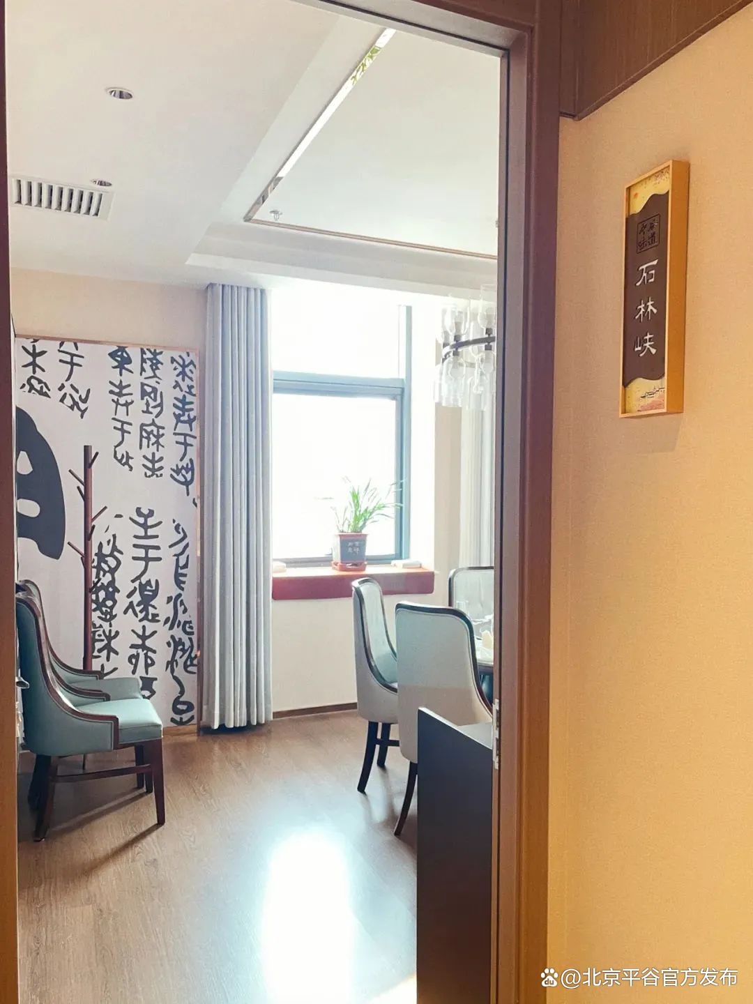一进餐厅,墙面上“服务首都新发展 建设高大尚平谷”高大尚平谷发展路径首先映入眼帘。平谷味道装修整整用时5个多月,今年9月开始试营业,楼上楼下两层十余个包间,将平谷地域元素完全融入进店内:走廊里摆放着桃木摆件、四座楼文玩核桃、轩辕石和金海石,室内装饰画和包间名字均源于平谷的文旅资源——金海湖、丫髻山、石林峡、桃花海等等;包间内还有平谷景区景观雕塑以及平谷艺术大师们创作的书法、摄影、剪纸、绘画等艺术作品。