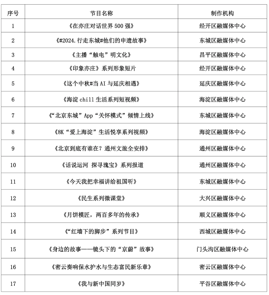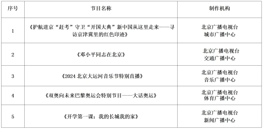 为深入学习贯彻习近平文化思想,进一步繁荣“北京大视听”广播电视精品创作,北京市广电局组织对2024年第三季度北京市广播电视创新创优节目进行评选,结合收听收看情况,经过专家综合评议,共评选出27个北京市广播电视创新创优节目,包括《护航进京“赶考”守卫“开国大典”新中国从这里走来——寻访京津冀里的红色印迹》等5个市级广播节目、《有力见证》等5个市级电视节目以及《在亦庄对话世界500强》等17个区级广播电视节目。