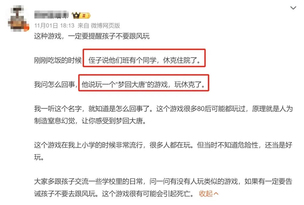 还有网友表示,自己侄子的同班同学因玩该游戏休克住院。