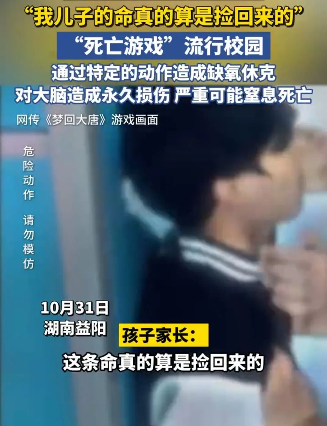 近日,湖南益阳有学生家长表示,一种“死亡游戏”在校园流行。该游戏被称为“梦回大唐”或“死亡三秒”。孩子在游戏后迅速晕倒,并曾发出尖叫,伴随满脸冷汗,直到第二天还感觉头痛头晕。