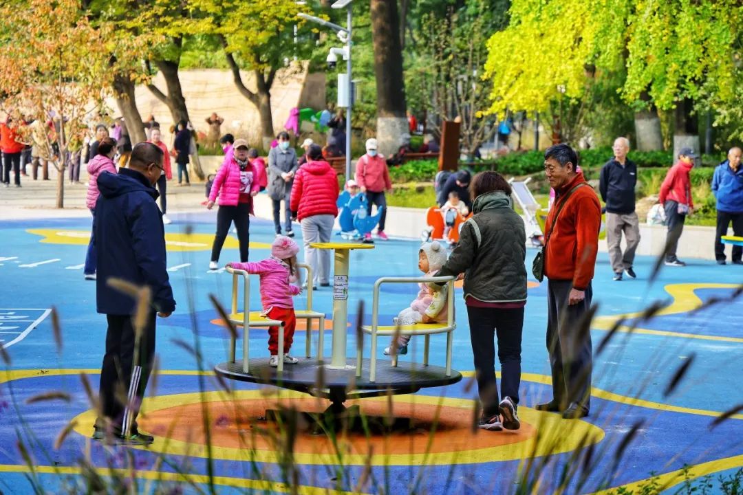 走进南馆公园,新建的全龄活动区成为居民们喜爱的“社区客厅”,老人们围坐在一起晒太阳、唠家常,新铺设的蓝色塑胶地面上,有红黄的彩色流线点缀着,孩子们在转椅、摇摇椅、白色沙坑等游乐设施上快乐玩耍。