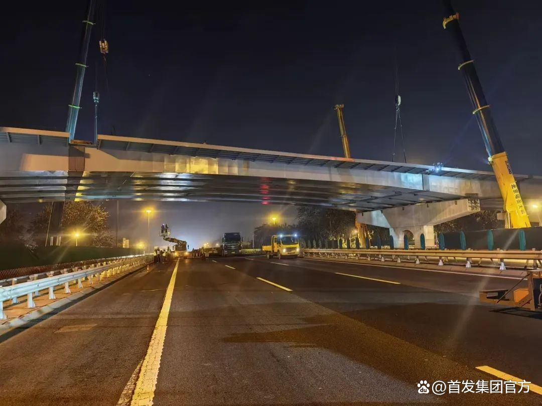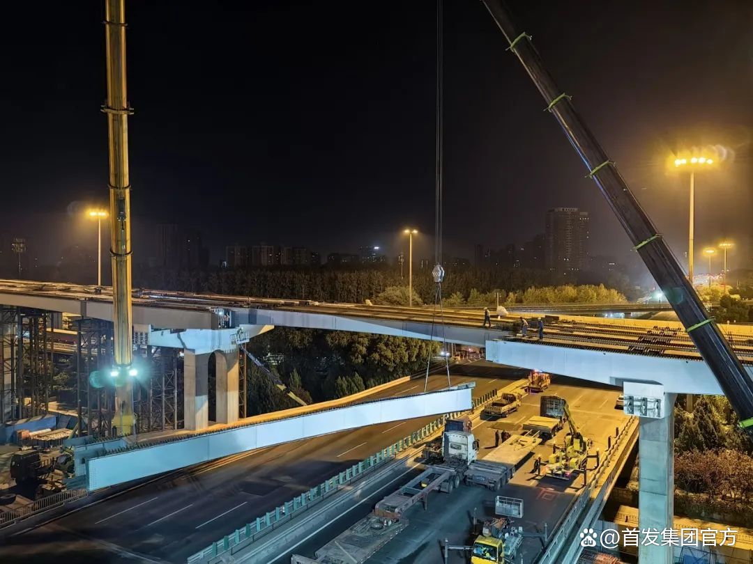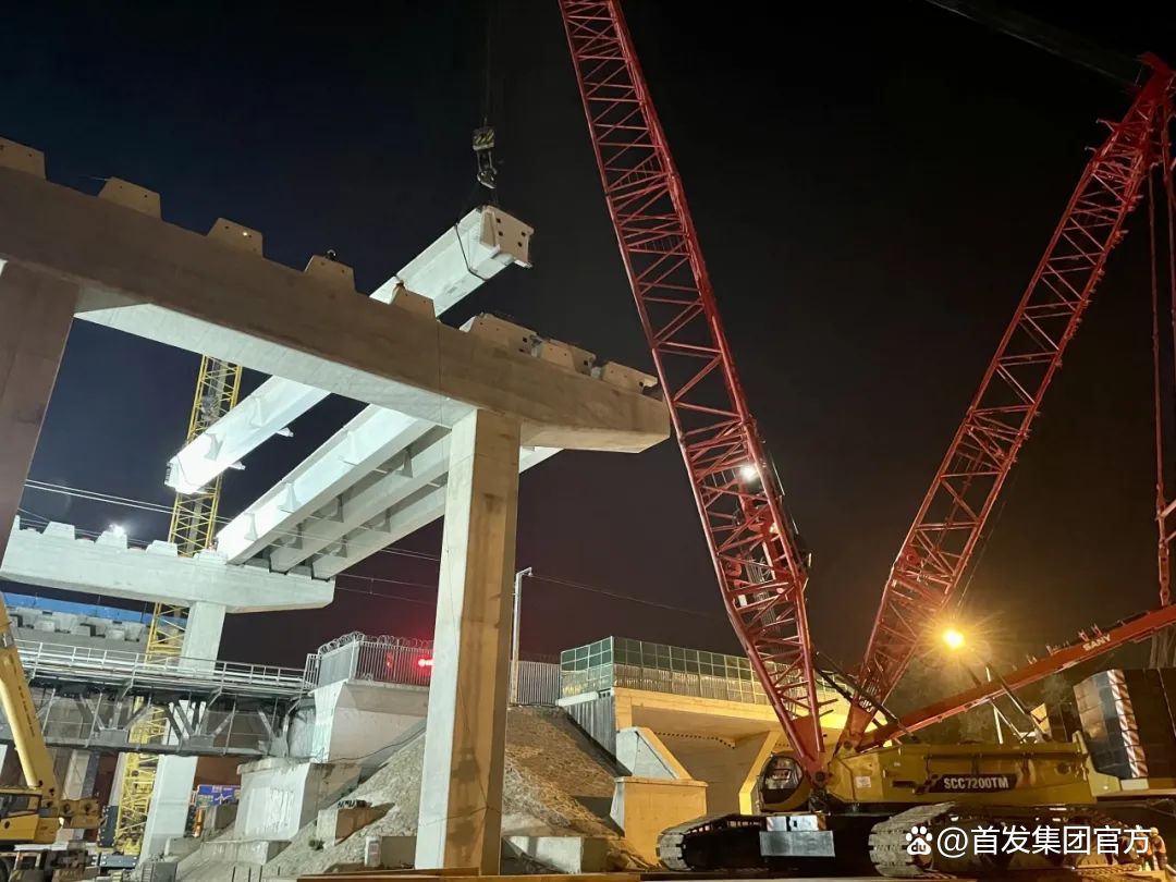 京密路上跨东北环线铁路采用1-40m小箱梁,单片梁重190吨,需要在铁路部门规定的时间内完成箱梁架设任务,施工难度之大堪比“针尖上跳舞”。施工采用600吨履带吊配合双机抬吊,最大吊装半径近50米,对吊车性能、吊车配合、架梁时间点控制精度要求极高,对于工程建设者而言是一次艰巨的考验。