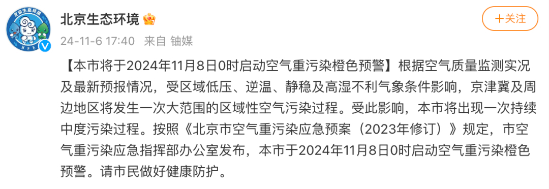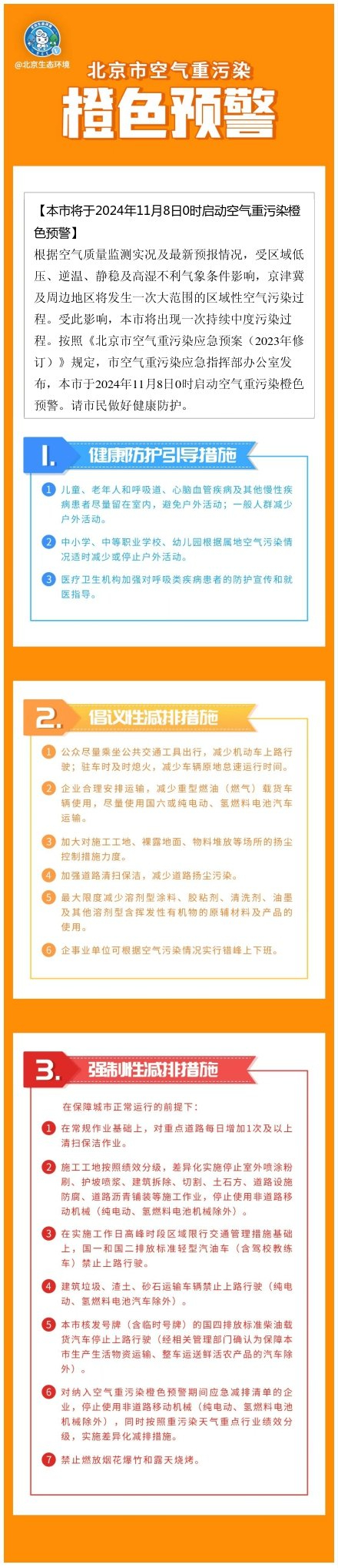 按照《北京市空气重污染应急预案(2023年修订)》规定,北京市空气重污染应急指挥部办公室发布,北京将于2024年11月8日(本周五)0时启动空气重污染橙色预警。请市民做好健康防护。
