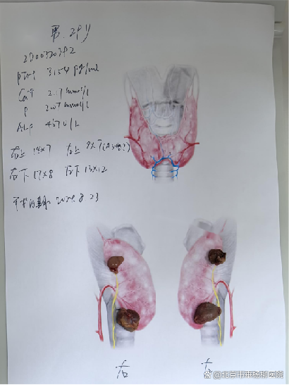普外科在每次手术后都会发一张甲状旁腺的位置图,图中不仅清晰标注了手术时期、患者的甲状旁腺激素水平,还精确记录了甲状旁腺大小。成为团队各专业深入研究和分析的重要资料。