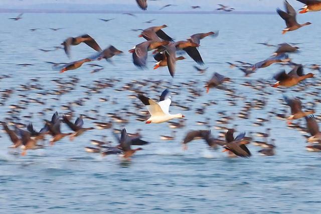 近日,衡水湖自然保护区在开展秋季迁徙期鸟类调查工作中,首次记录到国内罕见鸟类雪雁。在拍摄到的视频中,衡水湖湖面上水鸟翱翔,惬意自得,在密密麻麻的豆雁群体中,一只通体雪白的大鸟排列在队列之中,尤为显眼。