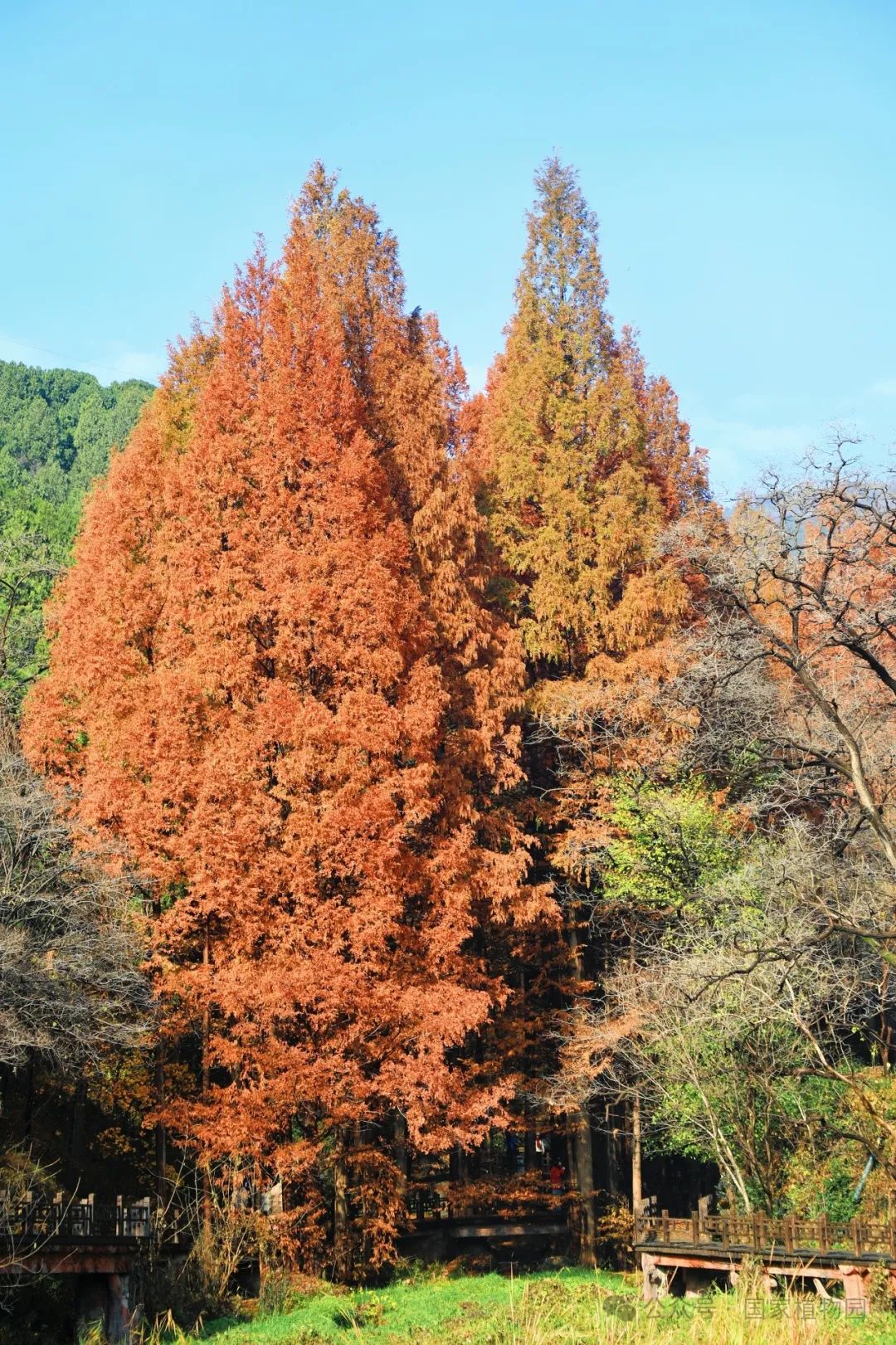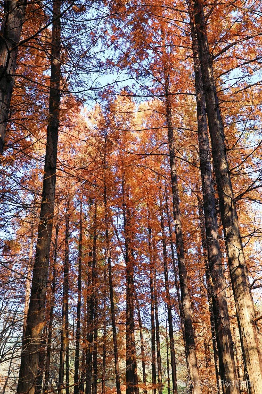 初冬的水杉林,褪去了青翠色彩转为火红的暖色。波光粼粼的流水,闪烁着耀眼的光芒,与深红的叶片交相辉映,构成了一幅绚丽多彩的画卷。风轻轻吹过叶片,纷纷扬扬飘落一地,宛如彩色的雨。蜿蜒的栈道,潺潺的溪水,挺拔高耸的水杉静静伫立两旁,尽情展现着古老的自然魅力,让人流连忘返。