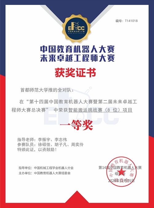 为了充分备赛,首都师大数科院组织遴选出兼具兴趣和一定研究能力的学生,提供网络信息平台。在指导教师悉心地课外指导、培训下,经过紧张的适应赛场调试、激烈的竞赛,由2022级本科生徐硕佳、胡子凡、周奕伶组成的首都师范大学“推的全对”队参加“机器人智能搬运挑战赛”项目比赛,孙宇同、张鼎原、赵世凤组成的首都师范大学“是十环对吧”队参加“机器人智能搬运挑战赛”项目比赛,袁正成、赵世凤、周奕伶组成的首都师范大学“一阵风行”队参加“机器人高铁游中国”项目比赛,三组队伍全部荣获一等奖。