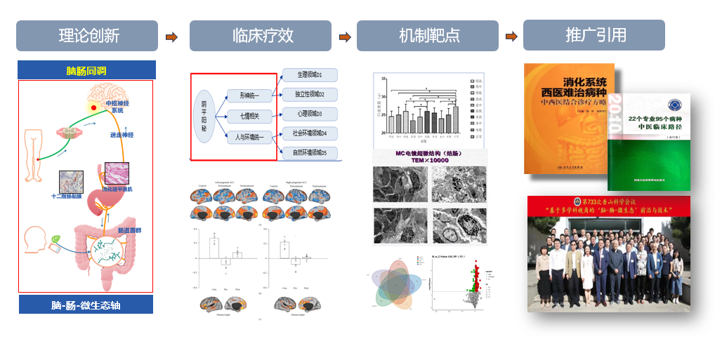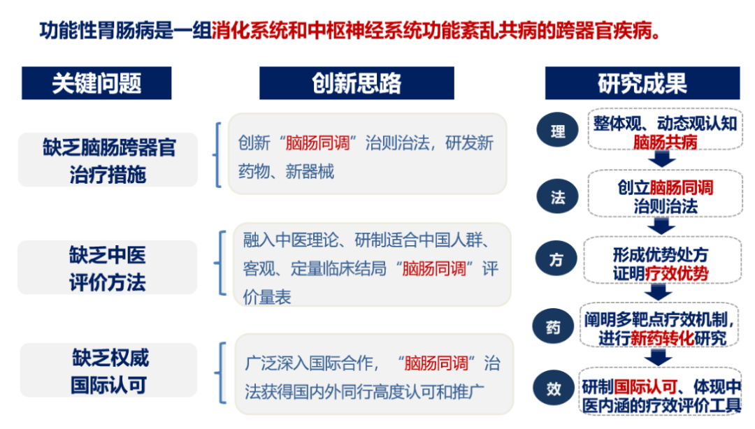 功能性胃肠病发病率高,治愈率低,属世界难治性疾病;由生理、精神心理及社会因素共同所致,是一组由消化系统和(或)中枢系统功能紊乱引发的,以胃肠道症状为主的消化系统疾病,以功能性消化不良和肠易激综合征最常见。流行病调查研究显示,全球超40%的人患有本类疾病。本类疾病机制未阐明,疗效欠佳。本项目在10余项国家、省部级课题资助下,对功能性胃肠病提出了新的治则治法,阐明了疗效机制,构建了评价体系,提高了临床疗效,填补了行业空白,获得了国际认可。