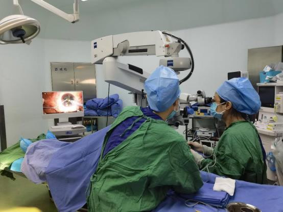 在医护人员的严密监护下,王应利主任医师和周玉梅副主任医师共同为周老进行了左眼的微创白内障超声乳化吸除联合人工晶体植入手术。整个手术过程历时二十分钟,虽然时间不长,但对术者的操作水平却是极大的考验。