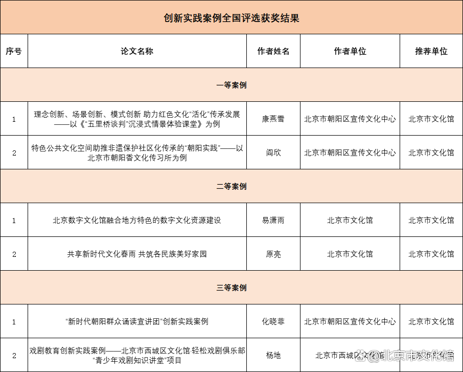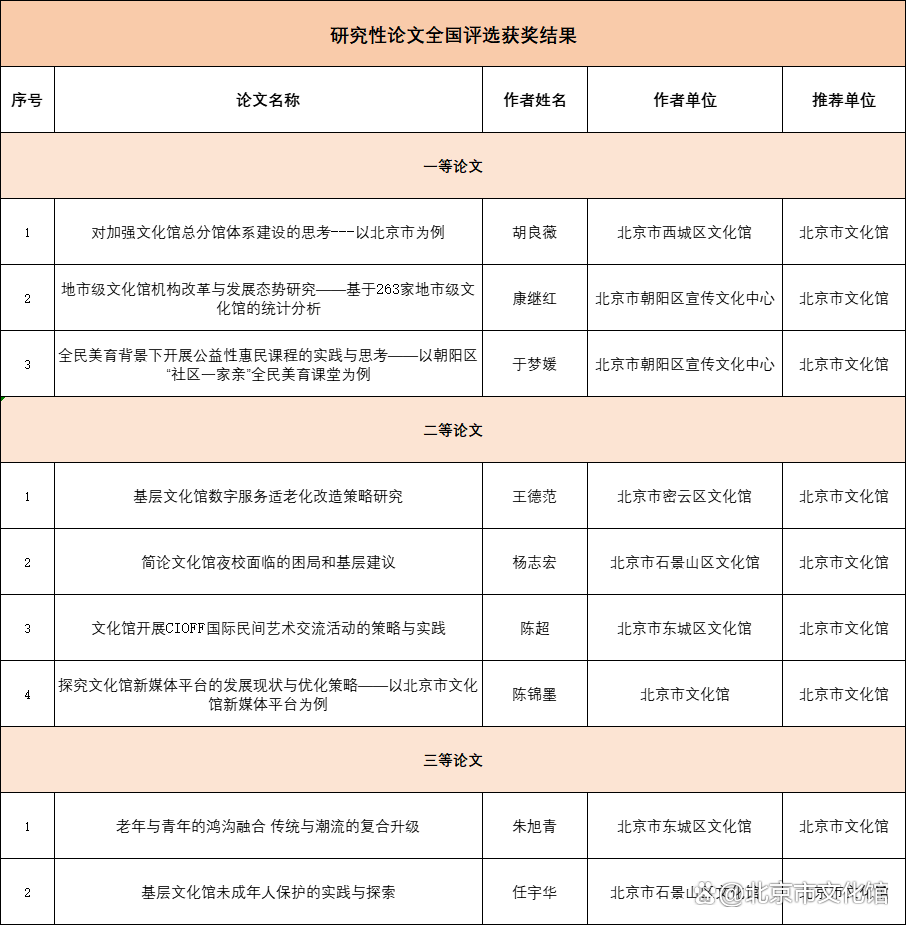 本次征文活动北京市文化馆邀请5位专家评委对研究性论文进行匿名评审,按照分数排名前30报送到中国文化馆协会参加全国评选,共获得一等论文3篇,二等论文4篇,三等论文2篇。创新实践案例获得一等2篇,二等2篇,三等2篇。北京市文化馆荣获“2024年中国文化馆年会征文活动“的优秀组织奖。