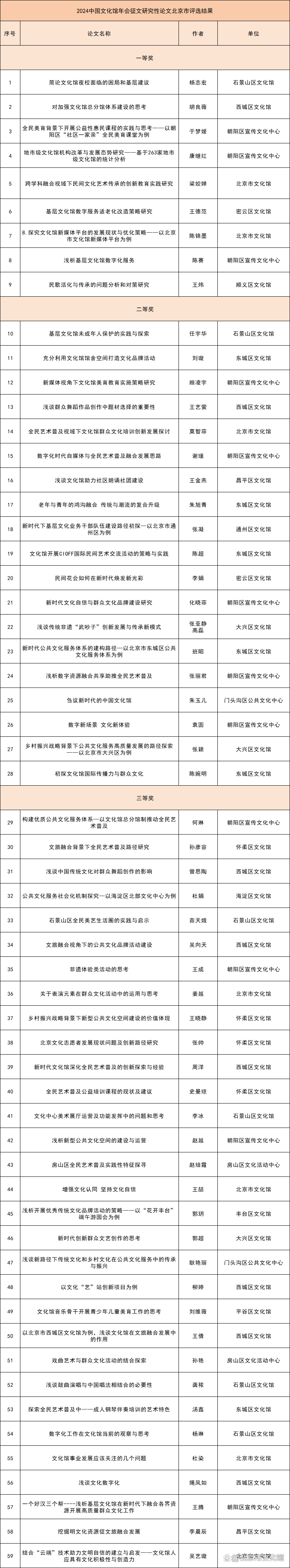 11月上旬,北京市文化馆公布了“2024中国文化馆年会征文研究性论文北京市评选结果”。本次征文活动依据中国文化馆协会《关于开展2024年中国文化馆年会征文的通知》开展,共收到全市各区15个文化馆67篇研究性论文,18篇创新实践案例。其中研究性论文符合征文要求及查重标准(查重率低于20%)的文章59篇。文章涉及到文化馆界关注的诸多问题,比如“文化自信”、“全民艺术普及”、“数字资源融合”、“优秀传统文化的传承”等。