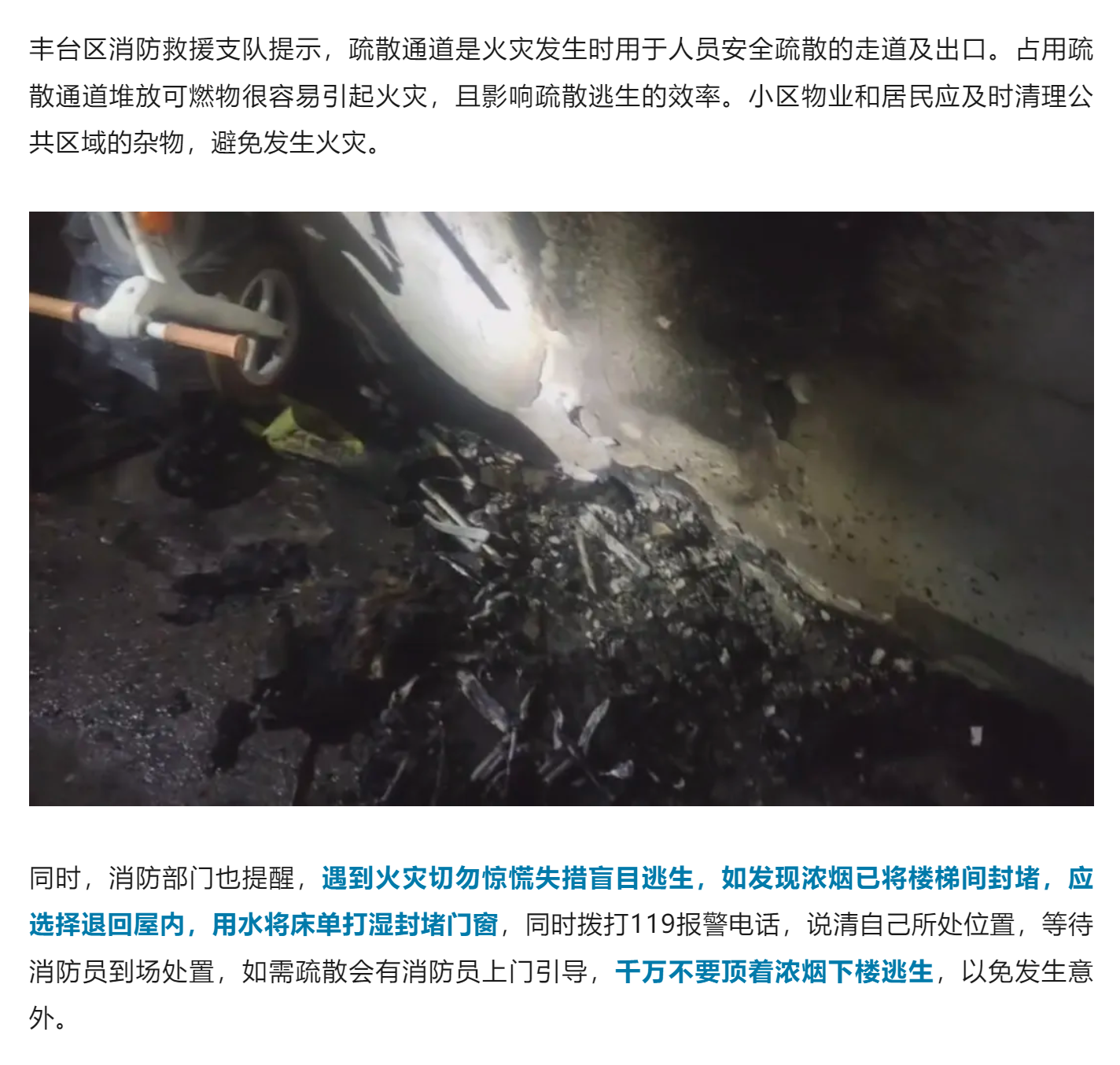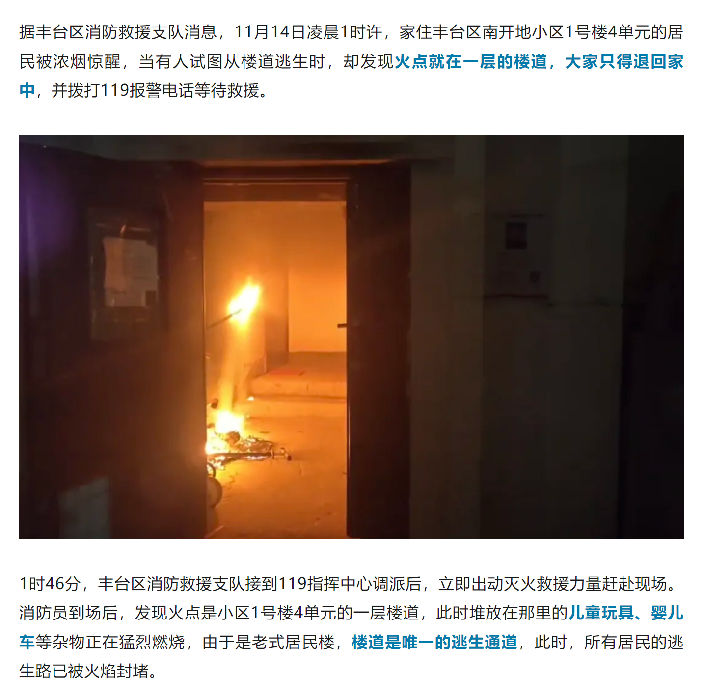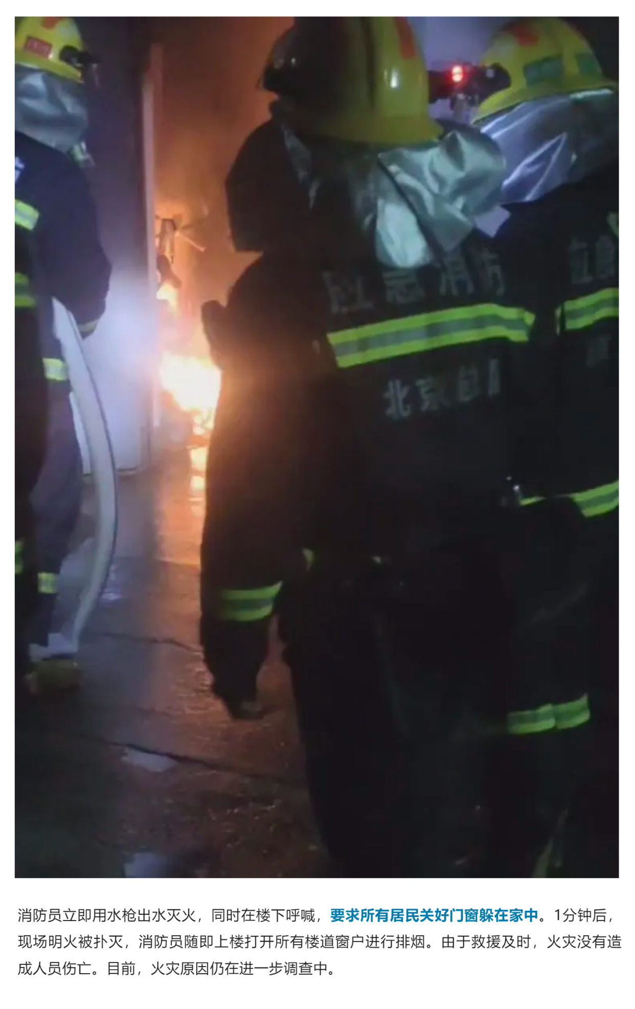 近日,在丰台区一小区,一层居民楼楼道内杂物起火,堵住了居民的唯一逃生路,好在消防员及时赶到,一边灭火一边要求所有居民关好门窗躲在家中。明火很快被扑灭,无人员伤亡,火灾原因仍在调查中。