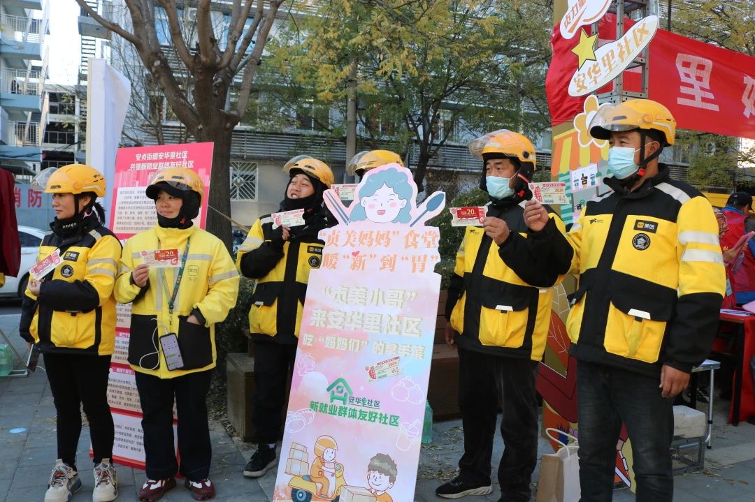 新就业群体友好社区的建设依靠辖区社会单位、社会组织、居民等力量的共同参与,此次贞美“新”家 焕“新”出发——安华里社区新就业群体友好服务市集就聚焦新就业群体特点和需求,聚集社区周边友好企业及商户力量,为新就业群体和居民设置服务摊位,在现场提供爱心义诊、中医理疗、理财服务、美食餐券、突发应急培训等十余项服务,并开展“两企三新”诉求建议搜集。特别值得一提的是,现场还有由社区居民构成的具有20余年历史的春志服务队和红娘小组为贞美小哥提供专属服务,友好市集额外供应300份蔬菜包和80份免费餐食,为新就业群体送上冬日的温暖.