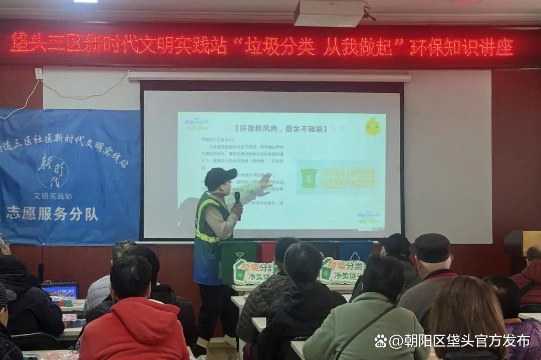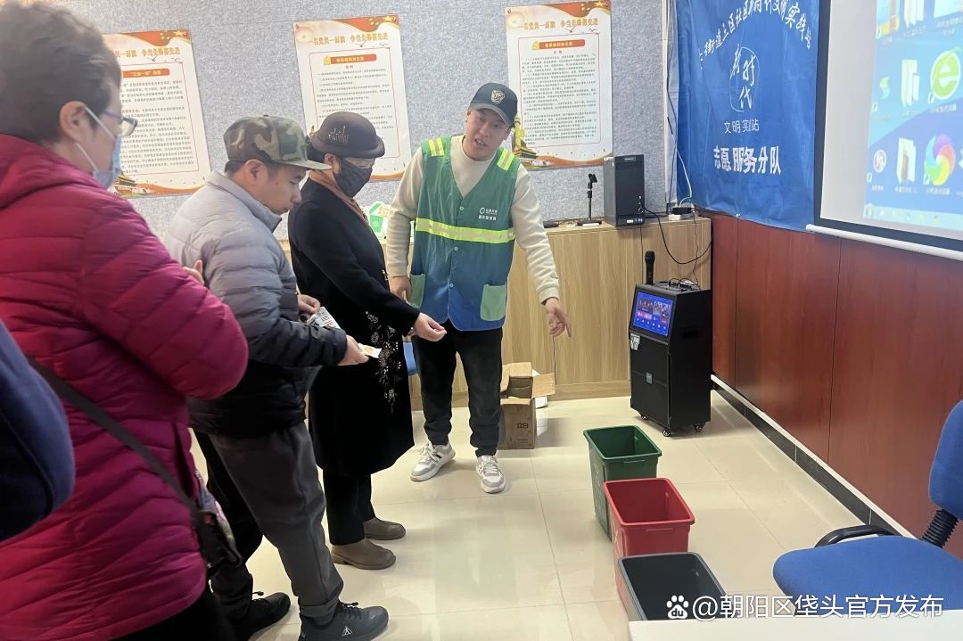垡头三区组织桶前值守的居民志愿者参加“垃圾分类 从我做起”环保知识讲座活动,通过志愿者带头示范、引导居民的方式,提高居民垃圾分类的投放准确率,助力社区居民垃圾分类习惯的养成。
