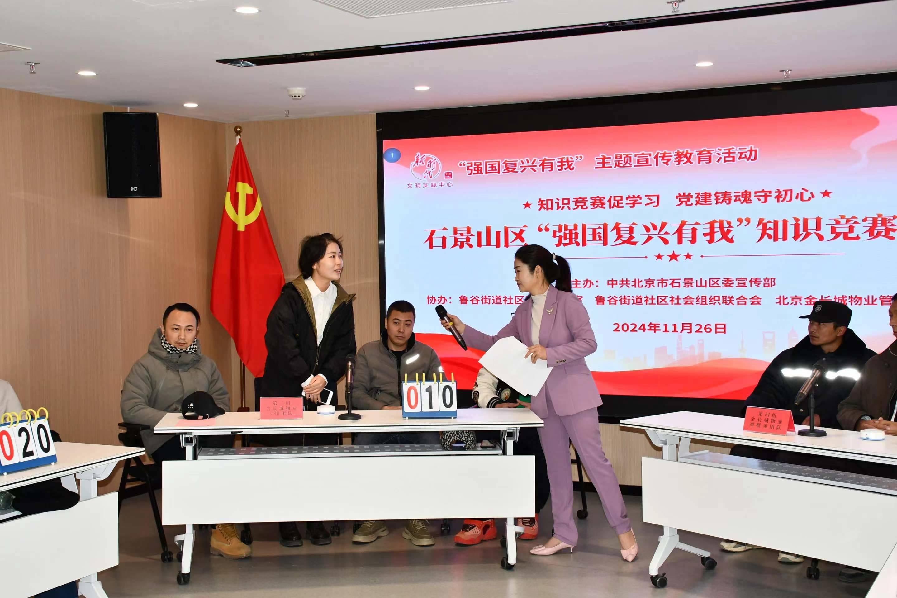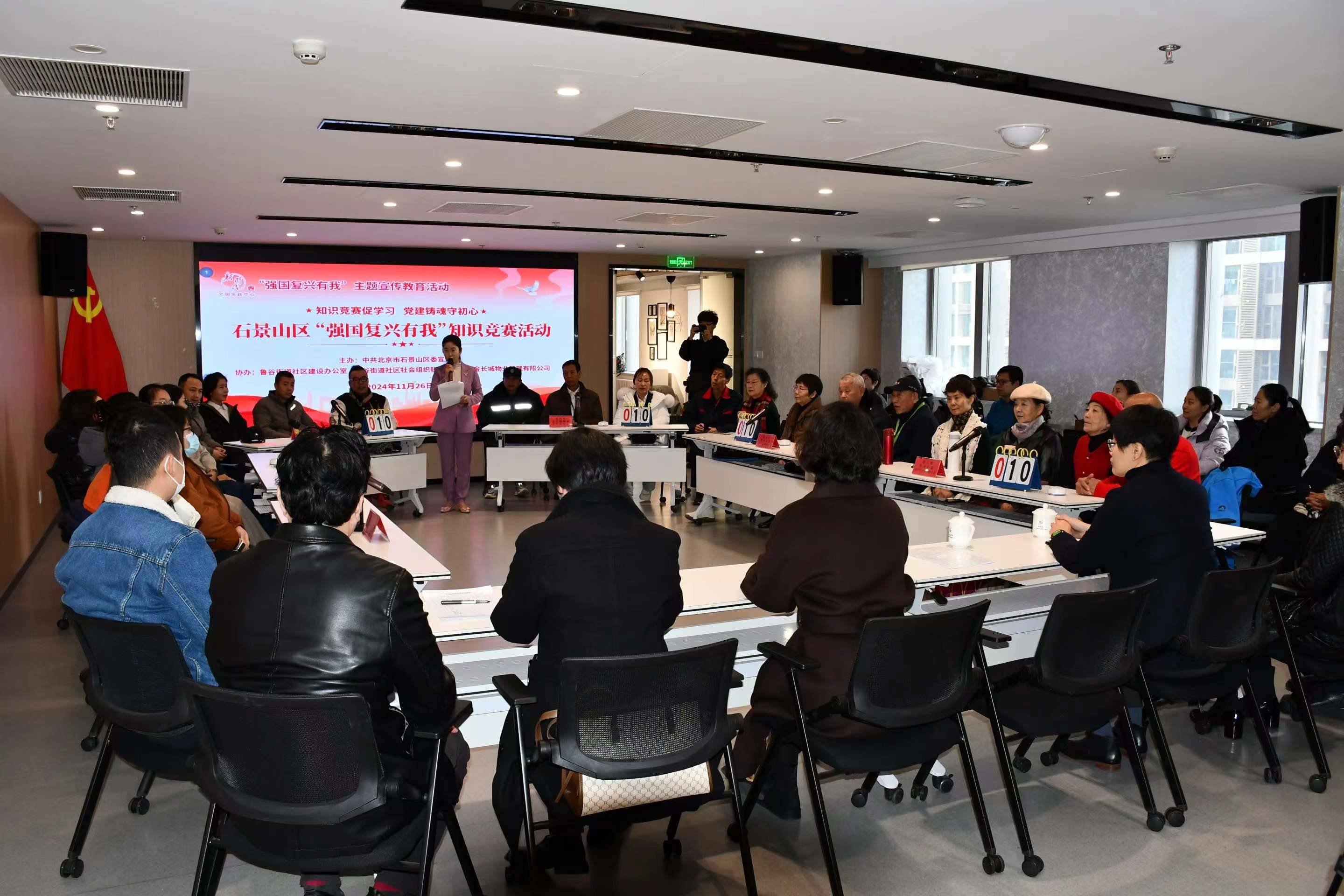 11月26日上午,一场主题为“强国复兴有我”的知识竞赛活动在鲁谷街道商务楼宇党群服务中心成功举办。本次活动由区委宣传部主办,并得到鲁谷街道、街道社区社会组织联合会以及CRD银座楼委会成员单位北京金长城物业管理有限公司的大力支持与协助。中共北京市石景山区委宣传部副部长白晓、宣传科科长王文静,鲁谷街道社区建设办公室副主任甘建新、鲁谷街道社区社会组织联合会会长张金春、北京金长城物业管理有限公司总经理李青等领导参加活动。