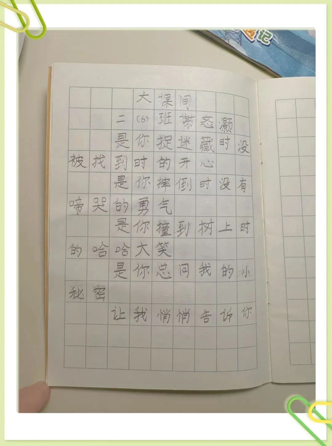 原来,学校里有群“小小歌唱家”,他们在课间坐在教室外的台阶上,教大家唱歌。在歌声中,我自由感受着歌声的美妙,忘记了时光。