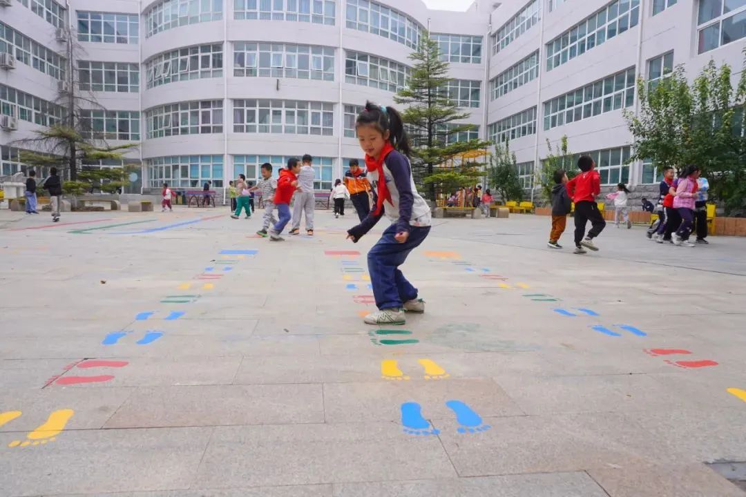 为了丰富学生室外课间活动内容,学校还在天井和升旗广场位置画了跳房子、立定跳等游戏场地,这里是低年级学生课间活动的乐园。活动中,老师们也积极参与,与学生一起畅玩,亲密无间的师生互动,拉近了师生之间的距离。孩子们的欢声笑语让校园充满生机与活力,我和孩子们一起在课间活动中感受快乐!