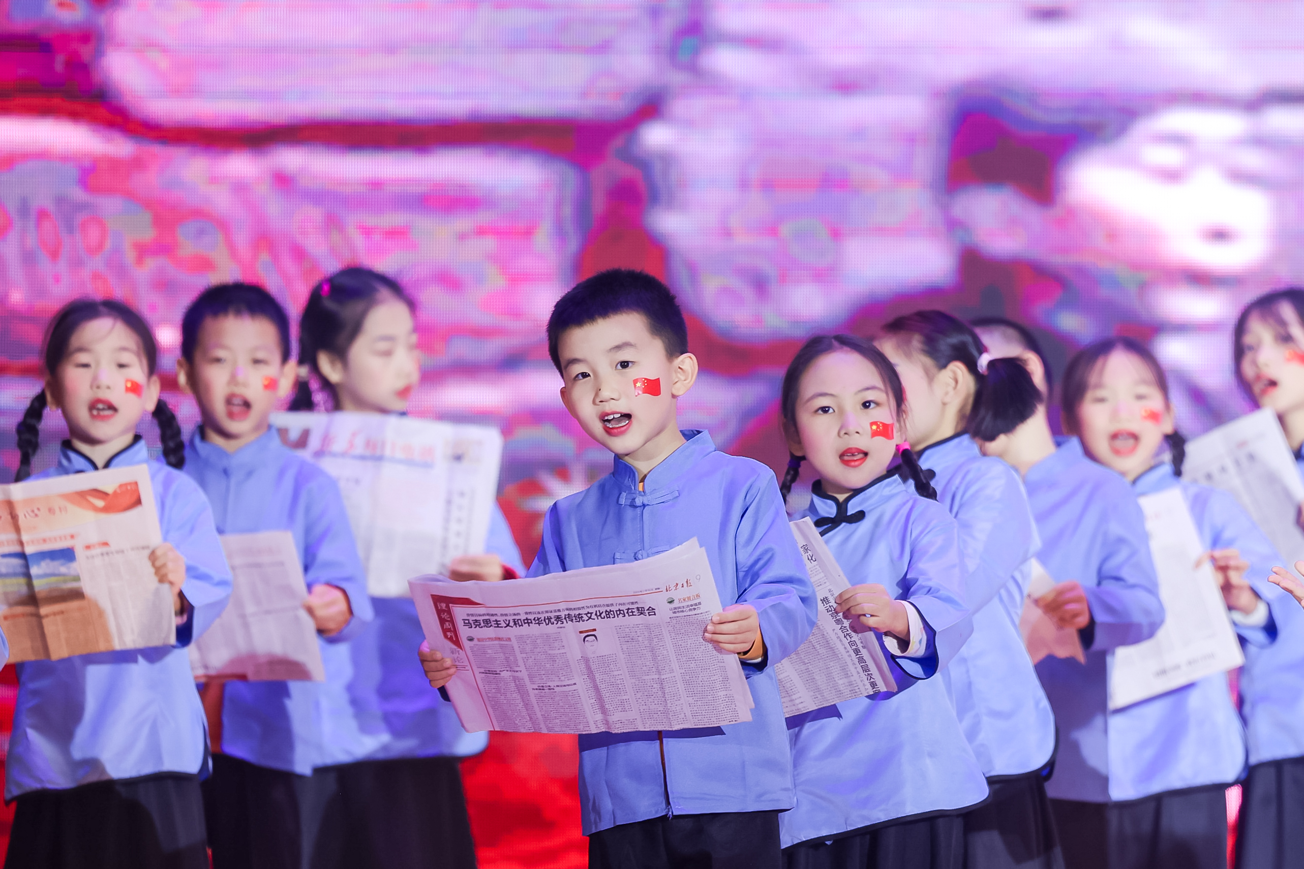 四(1)班的同学们唱响《童声里的中国》,以纯真无邪的声音描绘出祖国的大好河山与深厚的文化底蕴。一(4)班、二(3)班和二(1)班的同学们带来的歌曲联唱《国旗国旗真美丽》《我爱北京天安门》《祖国祖国我们爱你》,似清泉流淌,孩子们用稚嫩的歌声表达对国旗的尊敬,对祖国山河的热爱,满溢对祖国的赤诚眷恋与美好祈愿。身着小军装、手拿红缨枪的二(4)班、一(2)班、一(3)班和二(2)班孩子们表演的《红星歌》《只怕不抵抗》《卖报歌》《共产儿童团歌》更是展现了少年儿童的勇敢与担当,赢得场内阵阵喝彩。四(4)班表演的《竹石》告诉孩子们在面对生活的挑战与困难时,要像竹子一样,勇于挑战自我、超越自我。