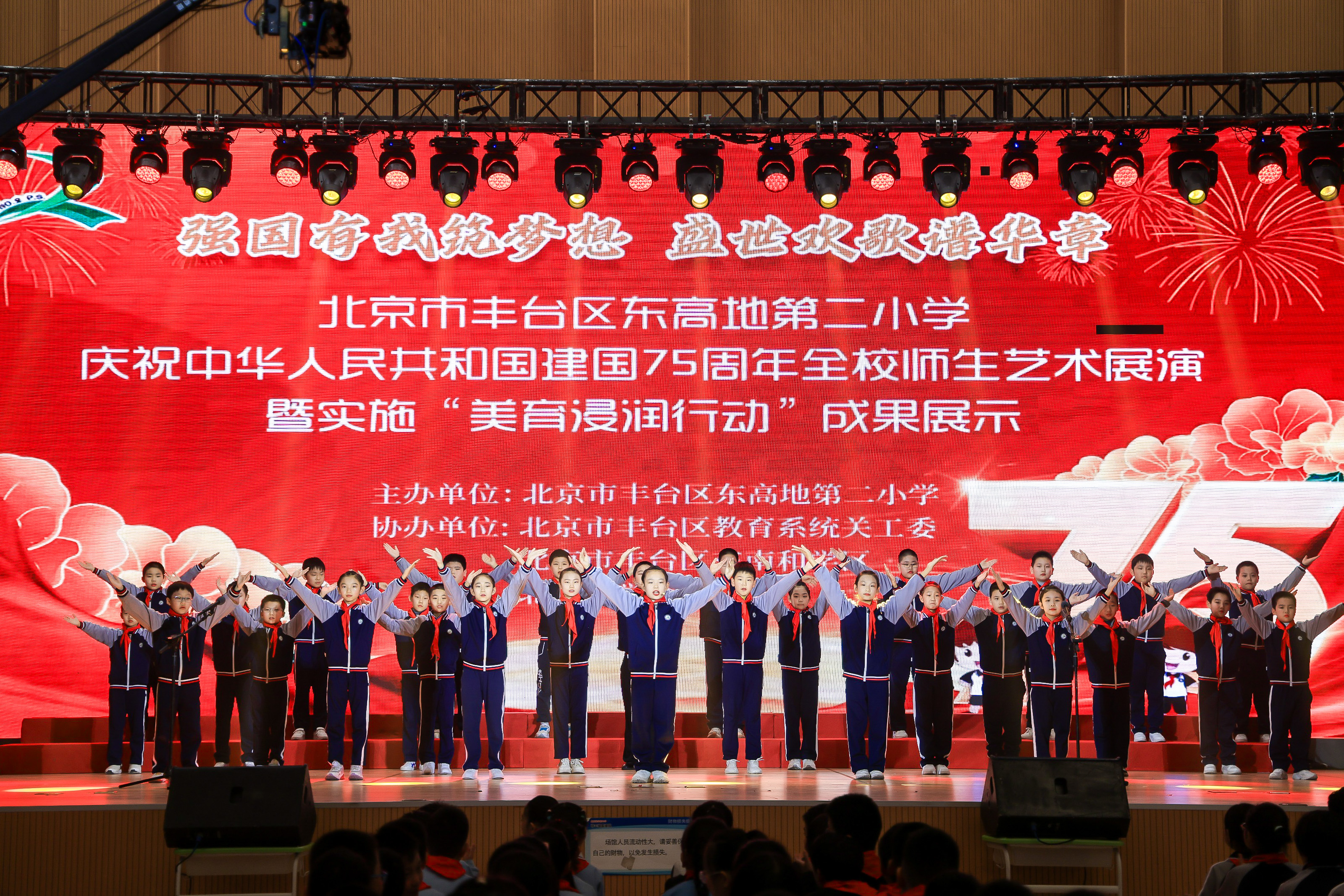 11月22日,丰台区东高地第二小学庆祝中华人民共和国成立75周年全校师生艺术展演暨“美育浸润行动”成果展示活动在北京钱学森中学举办。全校师生与家长代表满怀热忱,共赴这场爱国与艺术交融的盛典。