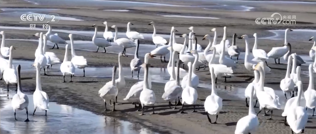 在保护区,数百只小天鹅成群结队,时而在天空中飞翔,时而在地面休憩,为冬日增添了生机与活力。