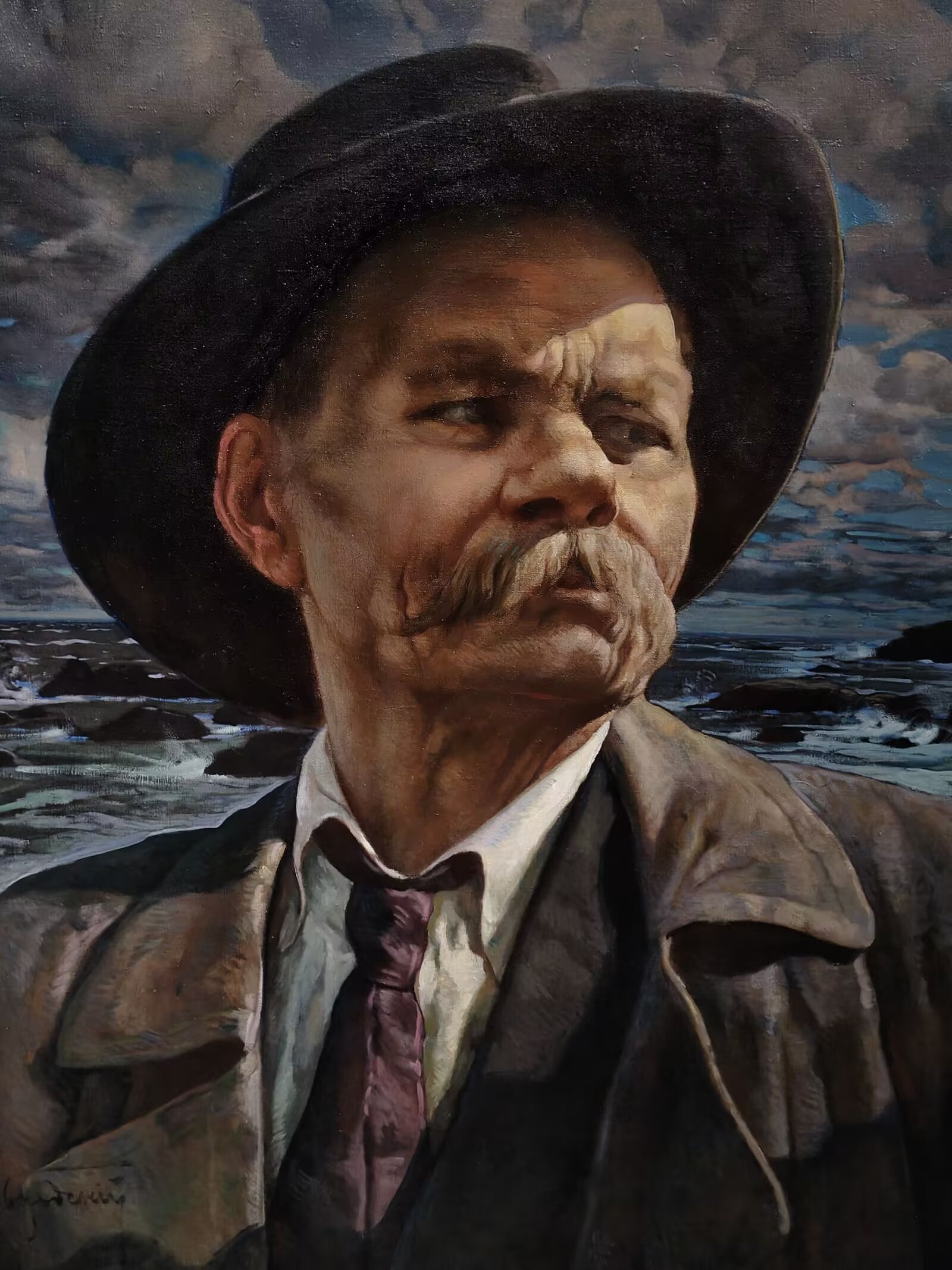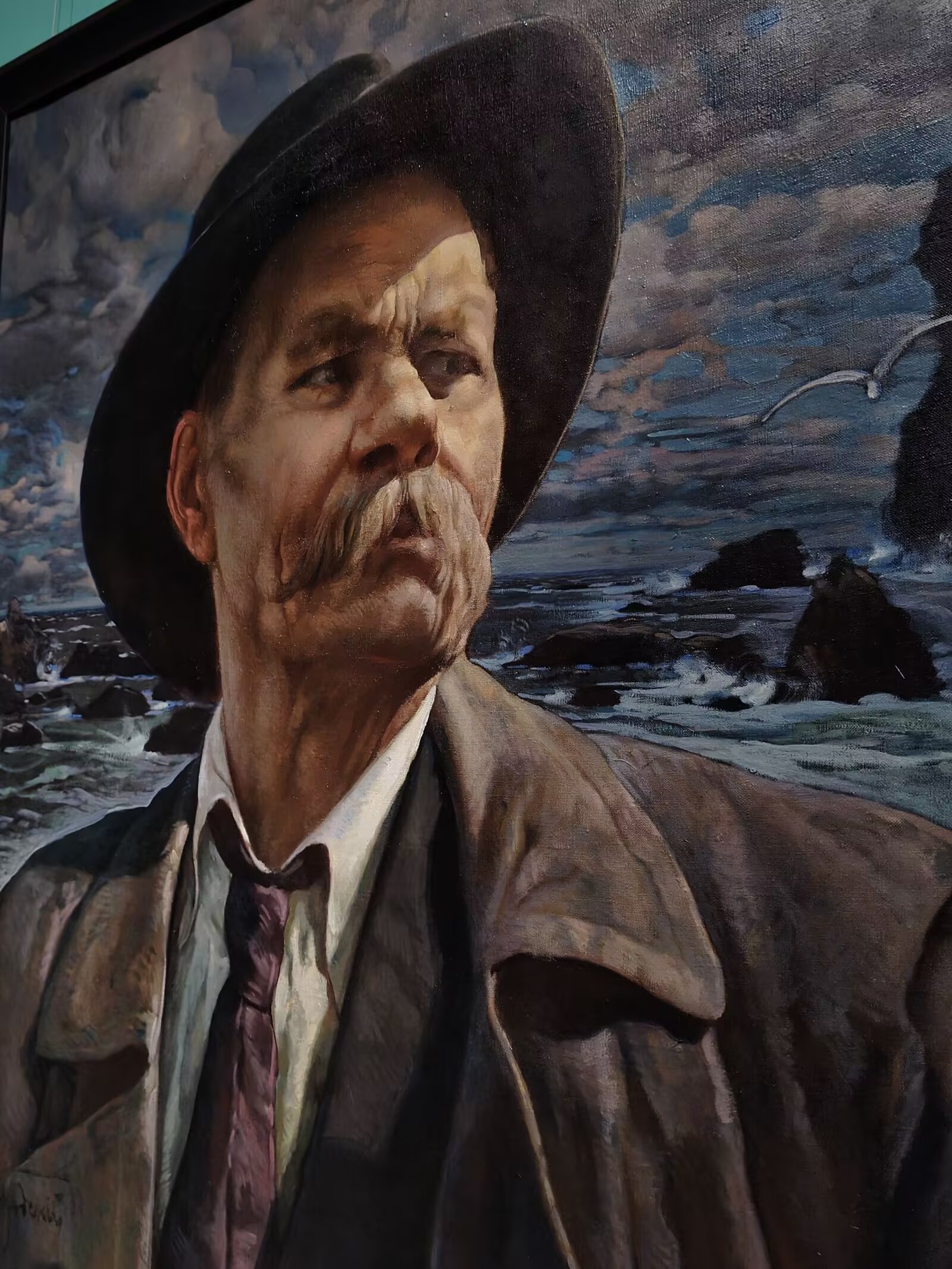 这或是我们最熟悉的一幅高尔基画作。它的背景,是波涛汹涌的大海(波罗的海?),以及海面上飞翔着的海燕。这幅作品,或出现在语文课本的彩页中,或出现在美术课本之内。