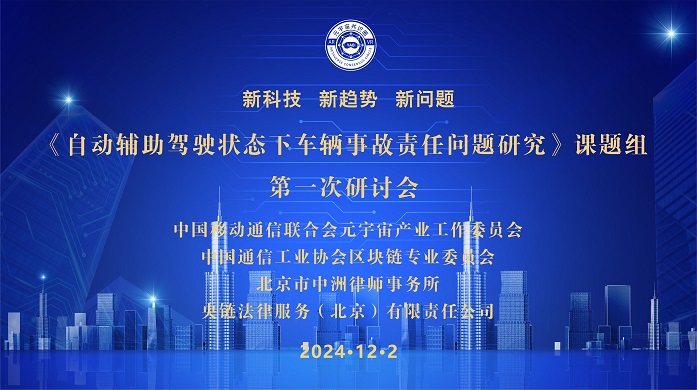 2024年12月2日,由中国移动通信联合会元宇宙产业工作委员会、中国通信工业协会区块链专业委员会、北京市中洲律师事务所、央链法律服务(北京)有限责任公司组织召开的《新科技、新趋势、新问题—自动辅助驾驶状态下车辆事故责任问题研究》课题组第一次研讨会,在北京市中洲律师事务所成功召开。