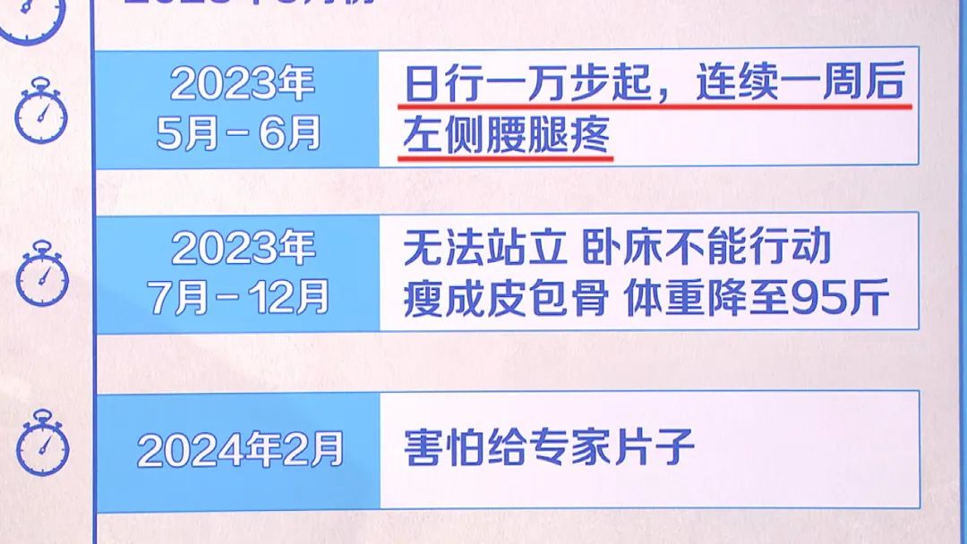 今天的节目,我们要带大家认识一位79岁的杨阿姨,杨阿姨2023年5月初的时候,外出旅行,当时她保持着日行一万步以上的频率,连续一周后,意外出现了!刚开始是左侧腰腿疼,两个月后,也就是7月份,杨阿姨就卧床不能行动了!腰腿疼是中老年人常见的症状,在这个过程中,杨阿姨到底忽略了什么样的诱发因素,才导致了这么严重的后果?现在她的身体怎么样了呢?敬请收看!