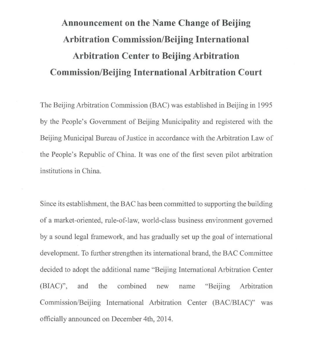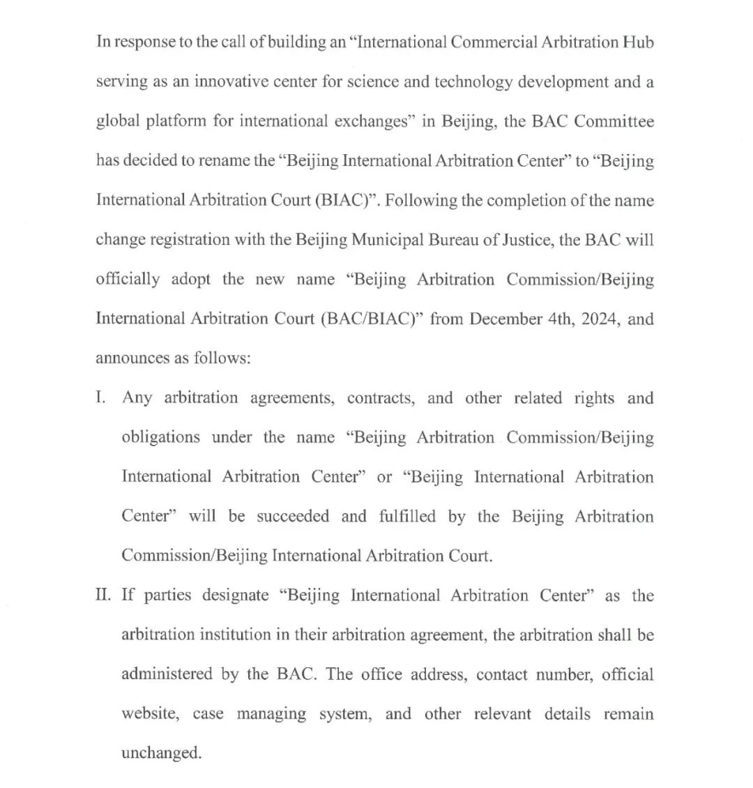 值此第十一个国家宪法日到来之际,为积极响应中央关于在北京市打造“服务国际科技创新中心与国际交往中心建设的国际商事仲裁中心”的要求,支持国际商事仲裁中心建设,经北京市司法局依法变更登记,北京仲裁委员会/北京国际仲裁中心于2024年12月4日将名称变更为“北京仲裁委员会/北京国际仲裁院”。