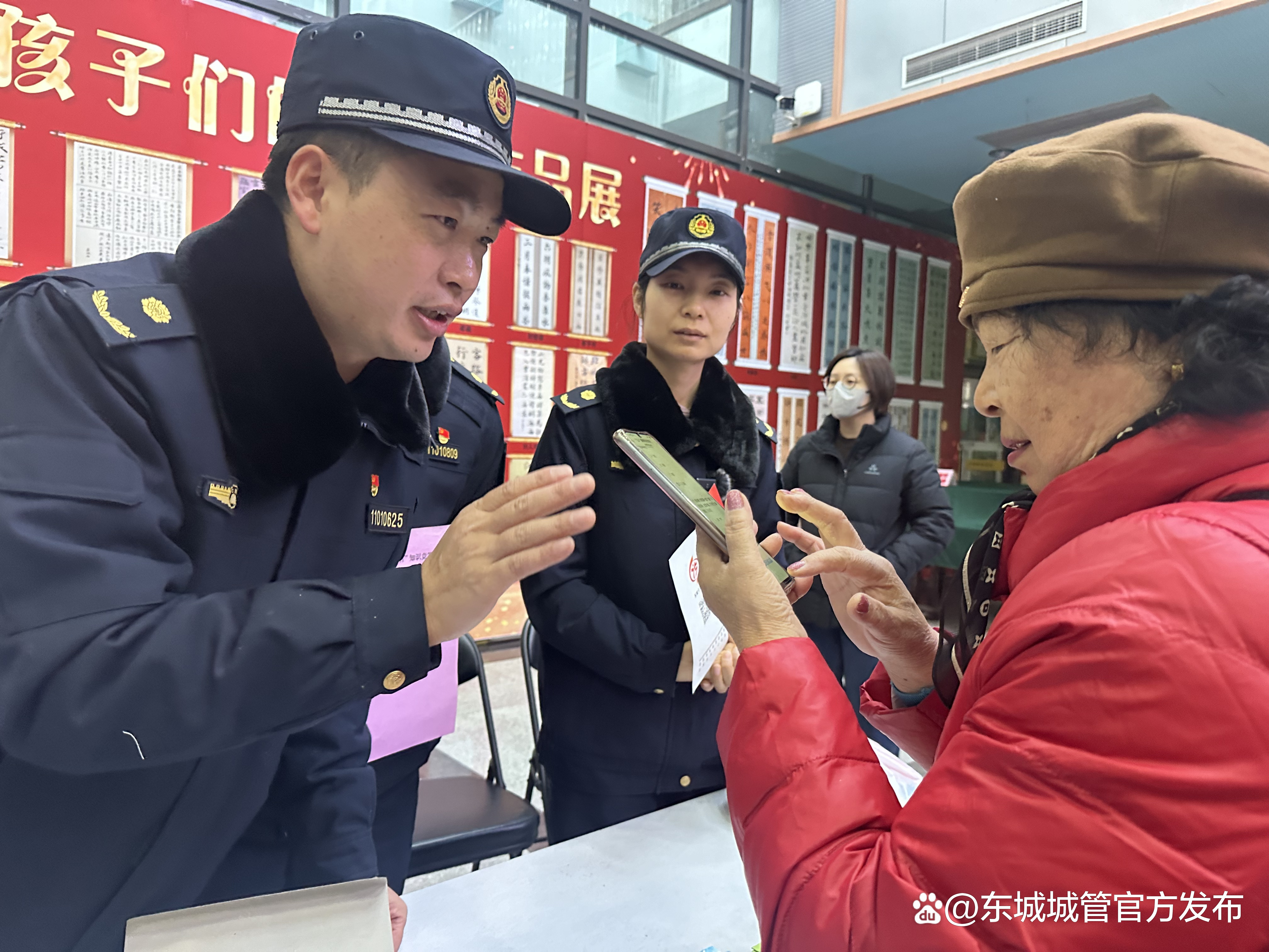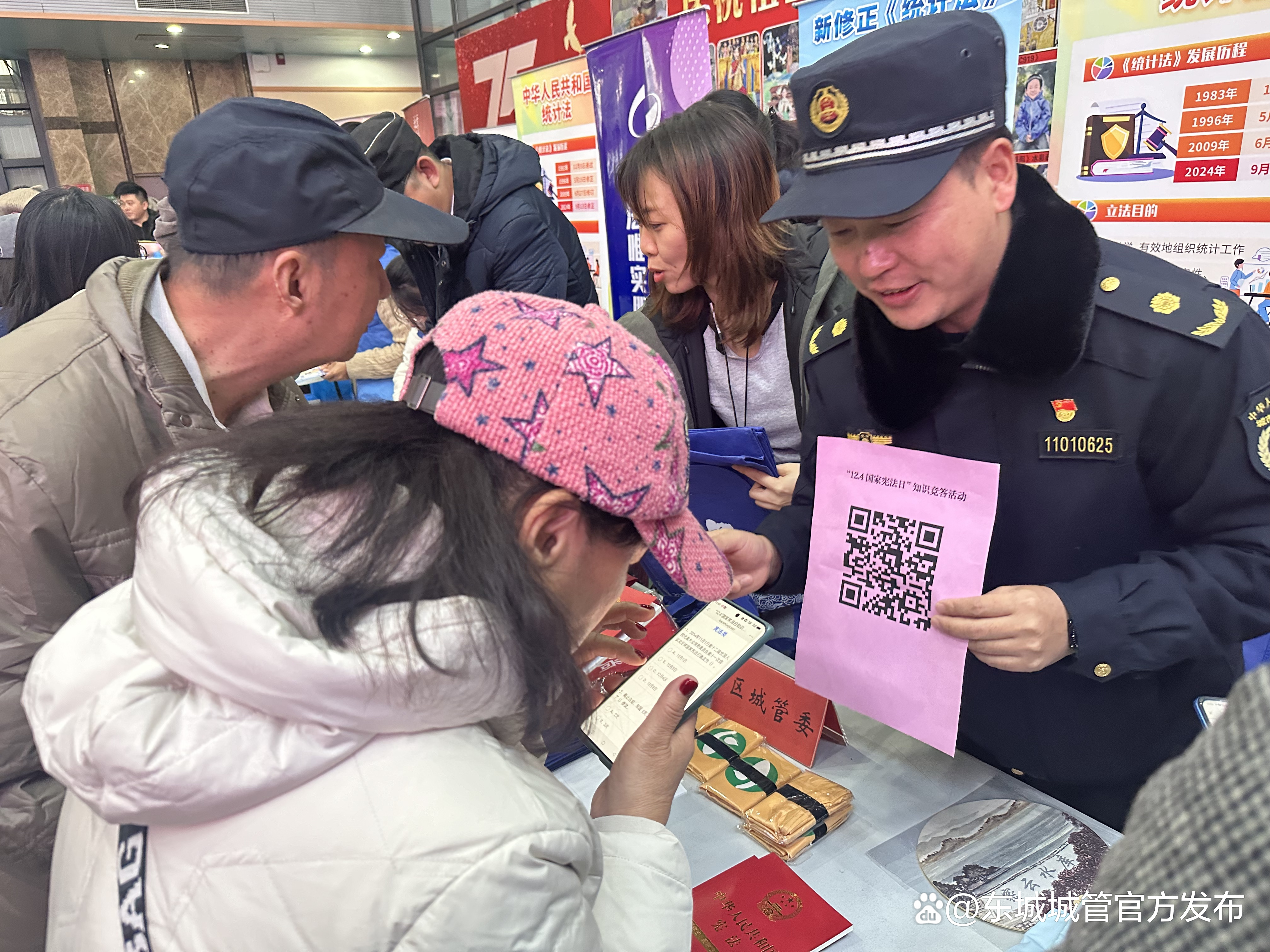12月3日下午,东城区城管执法局参加了由东城区委全面依法治区委员会守法普法协调小组、区司法局、崇外街道在东城区崇文少年宫,共同主办的以“大力弘扬宪法精神推动进一步全面深化改革”为主题的宣传活动。“欢迎大家踊跃参与知识竞答活动,扫码答题有机会领取小奖品哦!答对60分以上可得一份小奖品,答对90分以上可得两份小奖品,重在参与,希望大家多多了解学习法律法规知识!”活动现场,执法队员们一边手持答题竞赛二维码,一边邀请市民群众答题。不少活动参与者被吸引驻足停留,纷纷拿出手机扫码,开启了答题之旅。